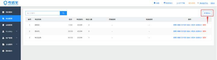 第一步、登录考试宝,*5cWQ63TbVTiLrPBFJyPUDBs!Fx;o4点击【考试sH*j&as$w5hNWiohdOq;*inZt管理】,右上角点击【新增考试】