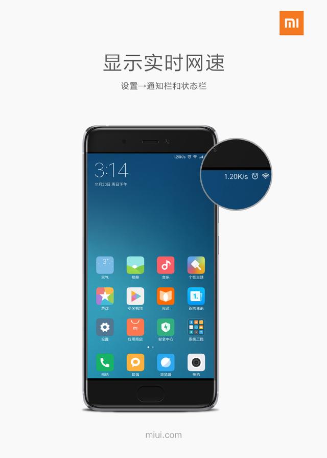 在通知栏上,MIUI选择了两种通知栏的样式:单页和双页。在设置里面我们也可以对运营商名称、通知图标、电量样式等进行改变。其中,我们可以通过设置,在状态栏显示实时网速。这个功能能够帮助很多用户对实时网速进行监控,防他人偷流量,也防自己的手机应用流失流量。