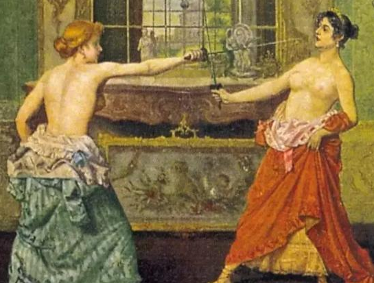 19世纪欧洲的女性决斗,因为担心衣物的纤维进入伤口后导致溃烂,所以她们裸体决斗