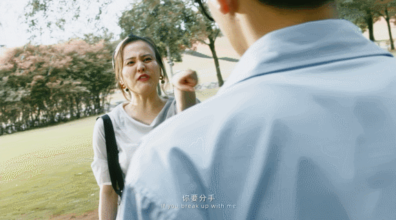 女生想靠撞树去挽留要分手的男生,(这是什么疯狂大胆又迷惑的示爱行为?看得我整个人要裂开)男生十分感动然后头也不回地逃走了。男生离开×4