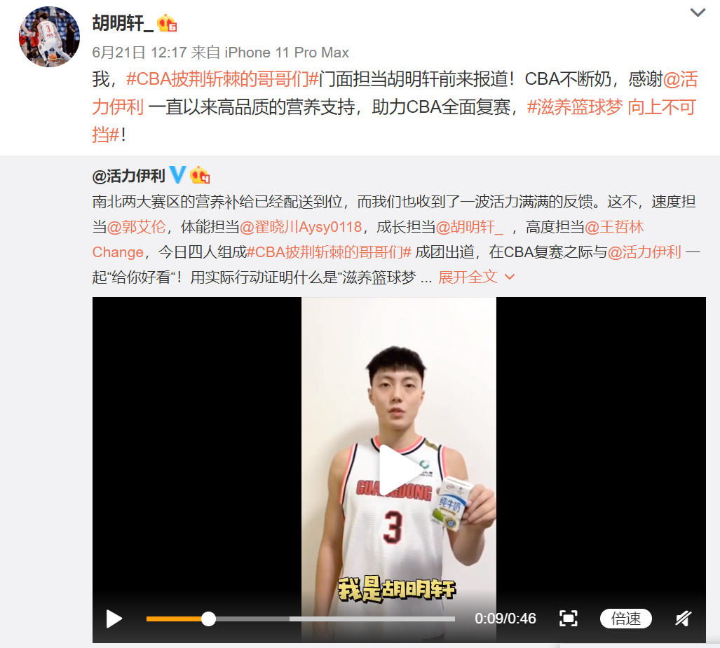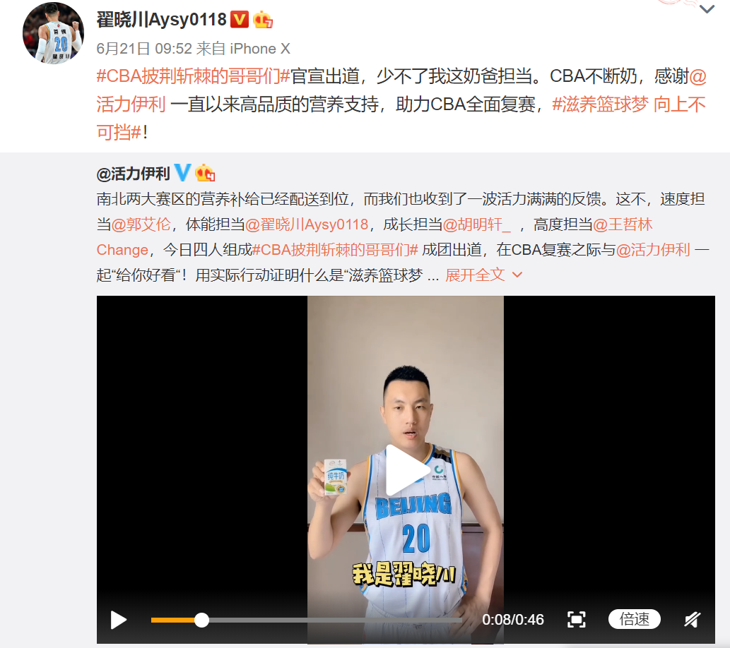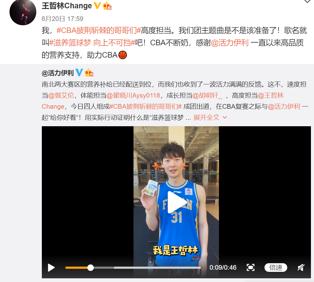 伊利先后把奶送到了东莞、青岛,四位男团成员和马布里、巩晓彬等球员教练纷纷表示感谢: