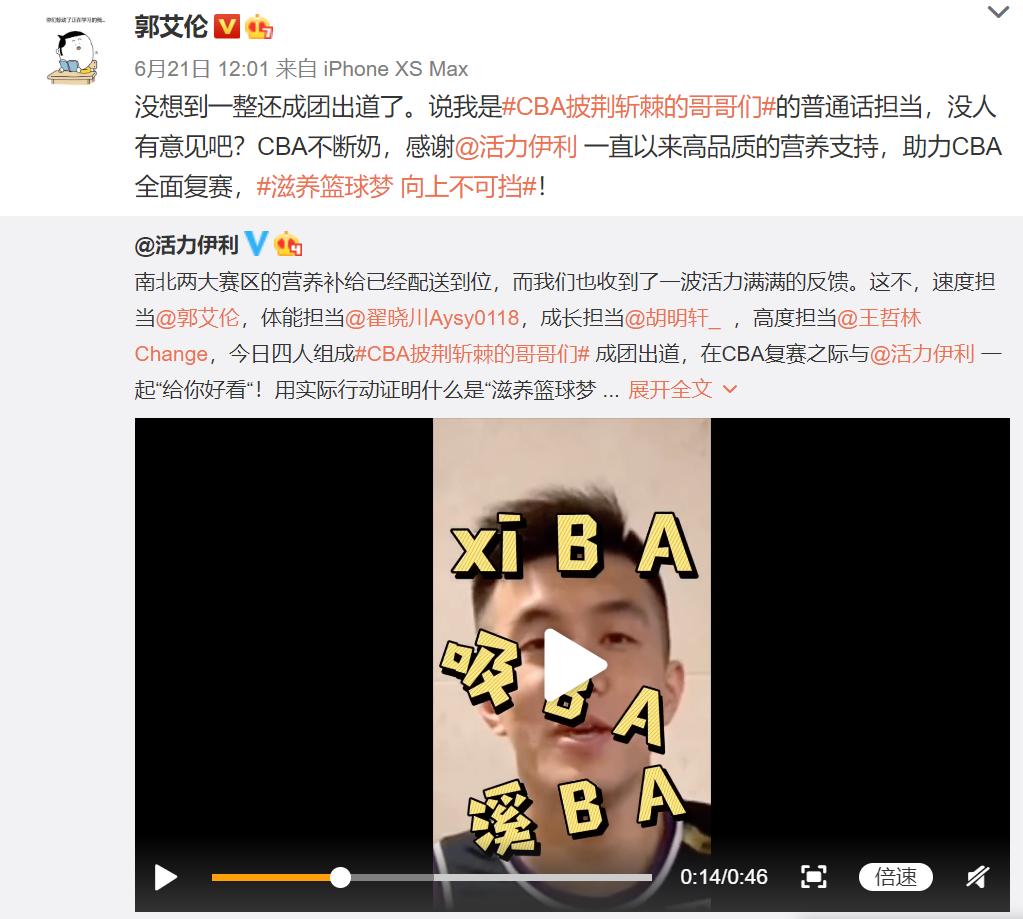其实,郭艾伦,胡明轩,王哲林,翟晓川4位球星早就是伊利CBA活力大使,最近被官宣#CBA披荆斩棘的哥哥们#成团出道:
