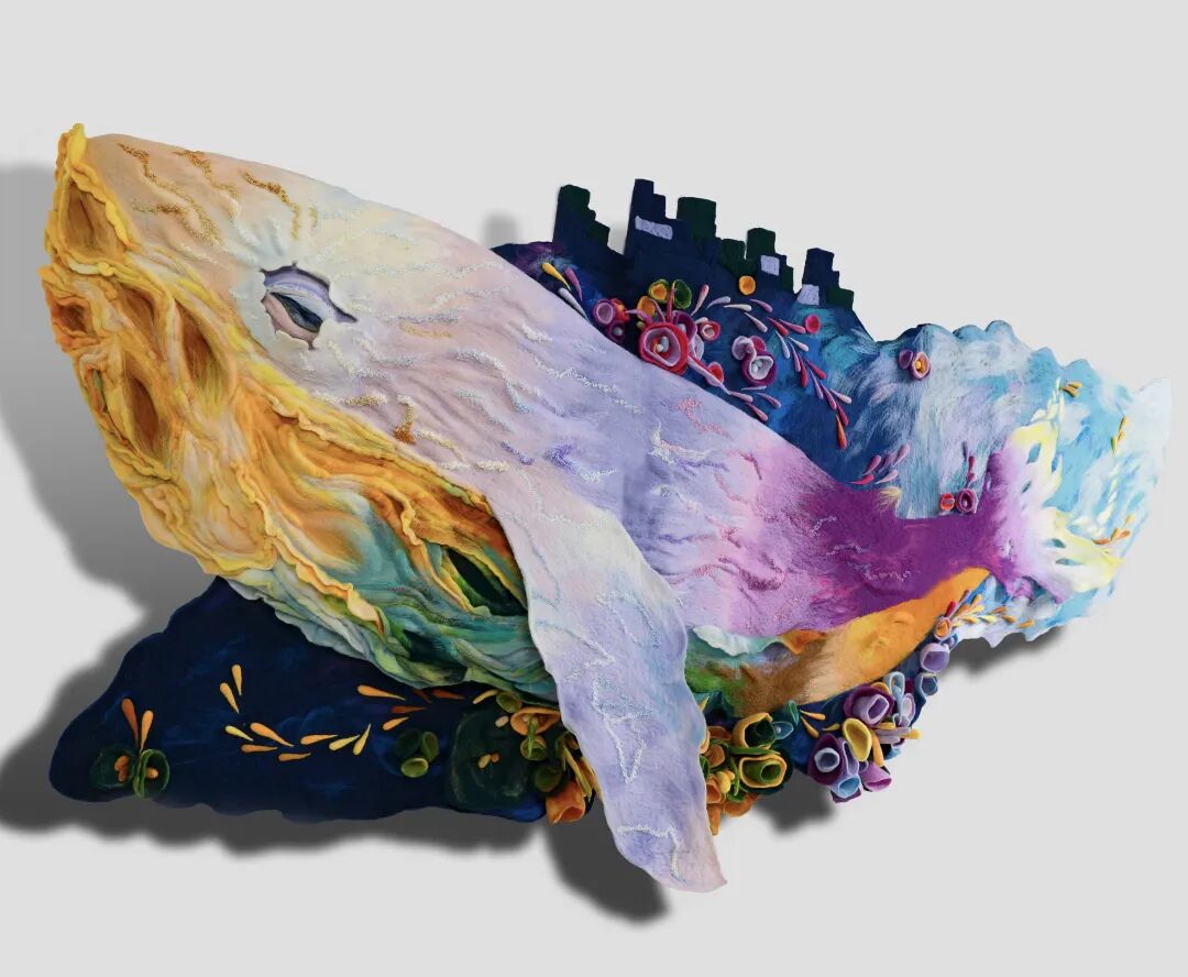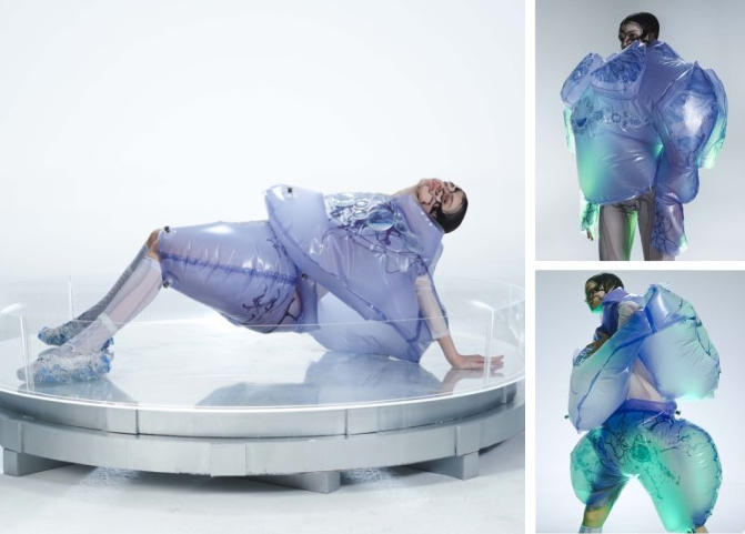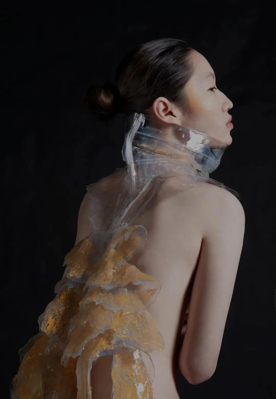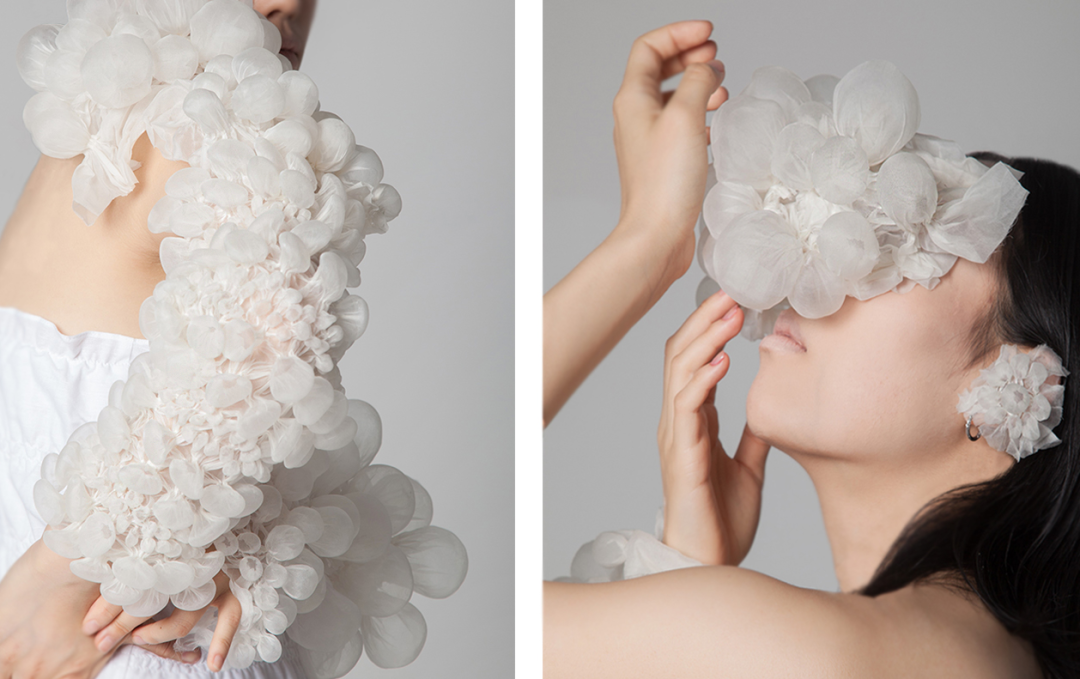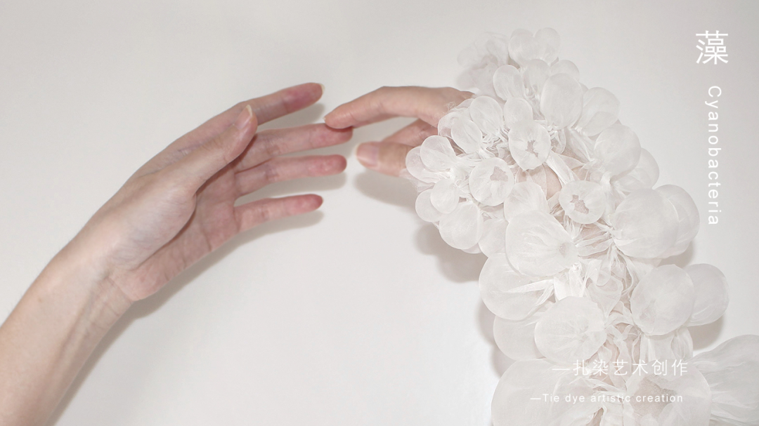 冼颖瑶同学以蓝藻类生物为灵感,利用天然真丝材料,灵活运用扎花的技法,纯手工制作出了这组设计。
