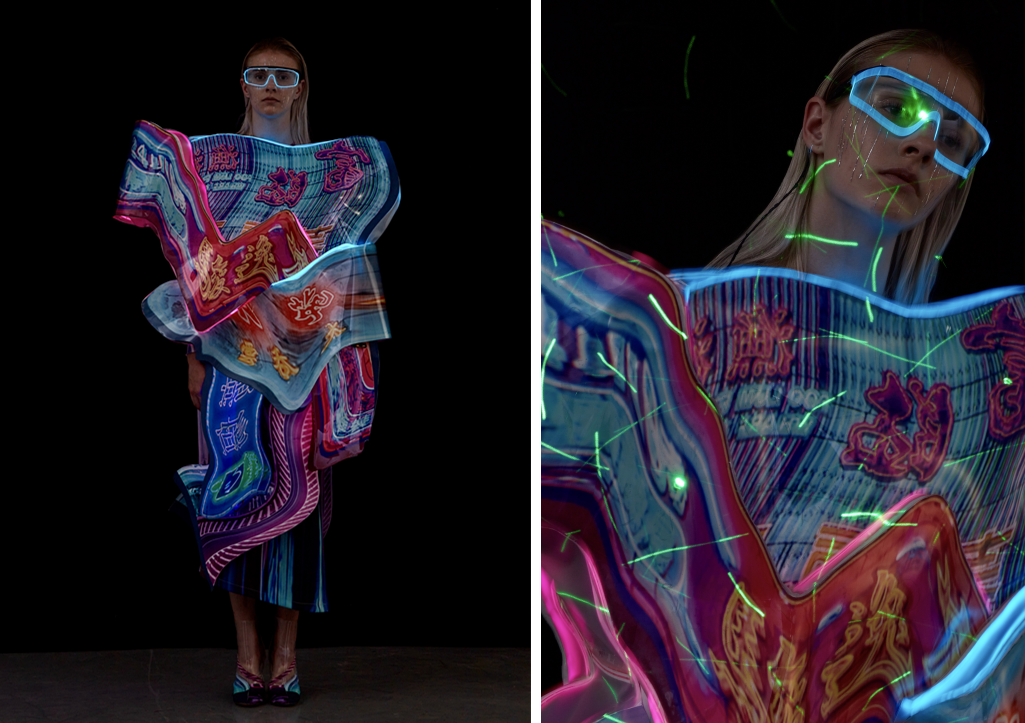 人们每天都会用电脑进行大量的文字搜索,康旭泽同学便将电子数据按照文字印画在服装上。
