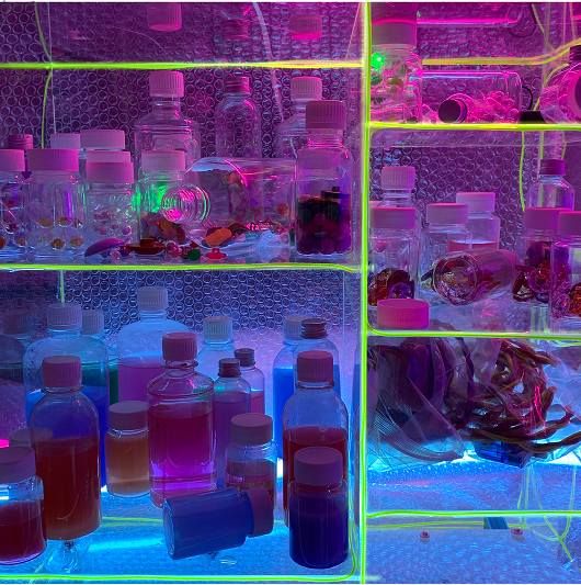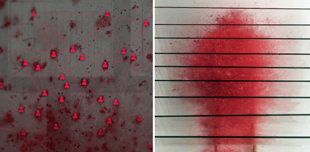 以新冠疫情期间确诊人数为灵感,在14层玻璃上,用色粉来展示,立体呈现这次事件的形状。
