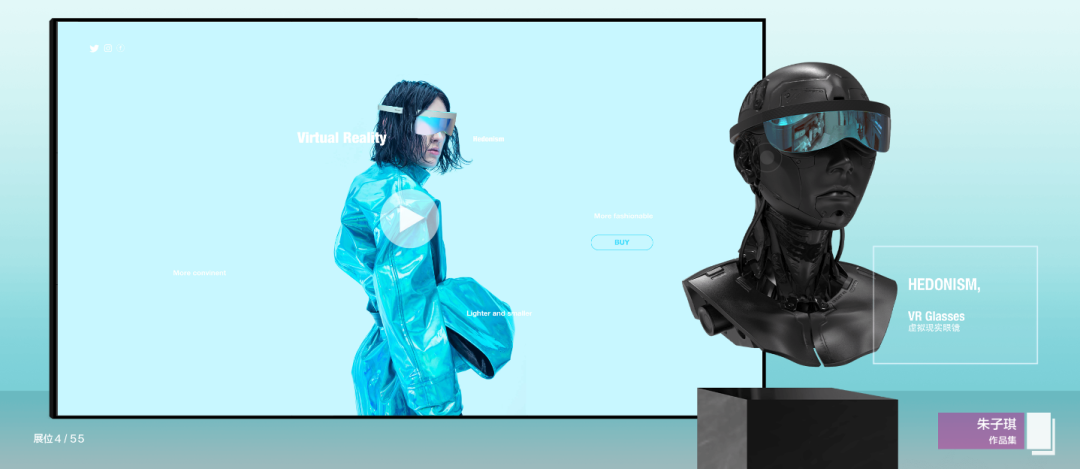 2.5D的展示,超真实的立体空间感,每张画、每件产品,每个屏幕,每堵墙,每个灯光,甚至每个交互,都是同学们亲手设计和布置的。