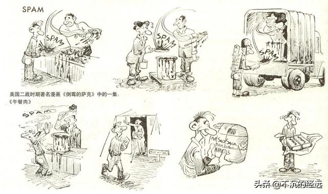 二战中午餐肉对于不同人的意味是不一样的,大部分国家的居民都把午餐肉当宝,至于美国大兵却因为吃太多而吃厌了。在二战前,美国的荷美尔食品公司开发出了一款午餐肉罐装,并以“猪肩肉加火腿”的英文缩写SPAM作为商标出售,因此也被叫做斯帕姆午餐肉。斯帕姆午餐肉成分包括猪肩肉、火腿、淀粉、调味品和亚硝酸钠,其口味有胡椒、烟熏、辛辣等10几种,是一种简单实用的快餐食品。即使在现在,午餐肉也是一种广受欢迎的食品,每年销量达到几十亿听。