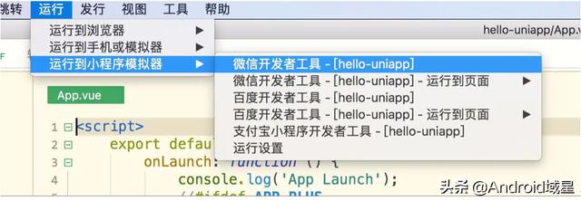 3. 在微信开发者工具里运行:进入hello-uniapp项目,点击工具栏的运行 -> 运行到小程序模拟器 -> 微信开发者工具,即可在微信开发者工具里面体验uni-app。