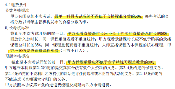 简单来说就是,考不过退款可以,但是学员也至少得在消防考试里拿够一半的卷面分。可是大部分学员连参加考试的资格都没有,于是此条退款方案卒。 又或者说,学员考不过可以申请退款,但必须得在嗨学网 App 里的固定录播课程之外跟满 80%以上的直播课程。 然而根据爆料者反映,很多直播课程都是头一天才会通知,对于上班族有时一个不注意就错过去了,因此第二条退款方案卒。 此外,这份服务合同里也对平常练习的得分、模拟测试的得分进行了限制。