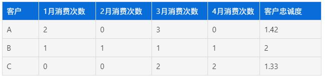 L代表客户忠诚度,t是消费周期,n代表时间周期,s代表消费次数、活跃次数等,计算结果L的值越大,说明客户忠诚度越高。