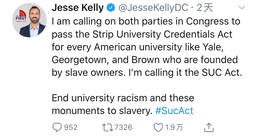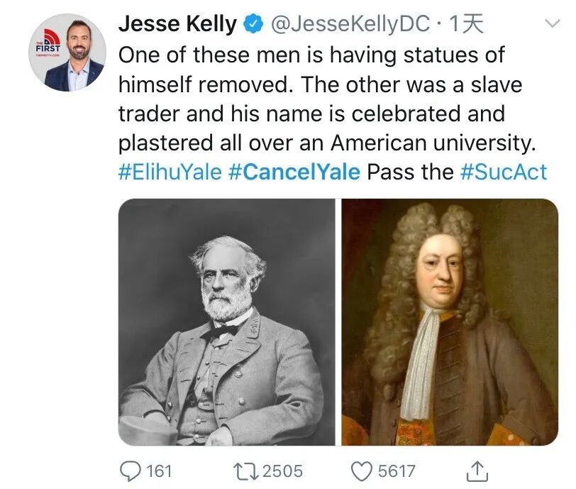 而Kelly更是直接在推特上喊话称,老罗斯福的雕像都可以被挪走,耶鲁还是以奴隶主命名的,为什么就不能改名?