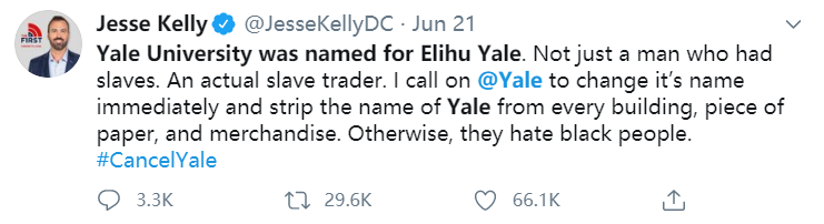 近日,美国一位右裔学者Jesse Kelly在推特上公开要求耶鲁大学改名,一石激起千层浪,