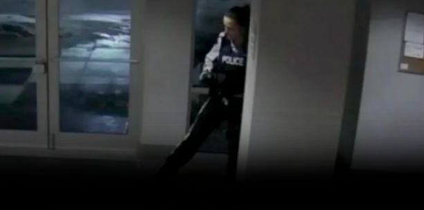 监控录像显示,这名女警官用手腕和手臂将戴着手铐、只穿着内衣的王王同学脸朝下拖进走廊和大楼的大厅。