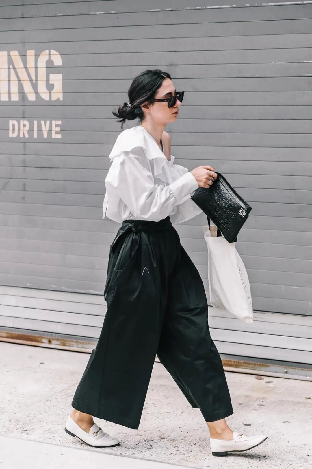 同时上装应该尽量选择白色,而下装带有一种承托的力量更应选黑色。因为白色视感轻浅,适合作为上方的留白~而黑色视感沉重,应作为底部承托角色。否则整个比例就会显得头重脚轻,上下失衡。生活中很少看到“下白上黑”的搭配,如果有,那是因为上装有轻盈感,营造留白的氛围,或柔软的黑色上衣,才可与下装的轻盈达到平衡。取黑白一色做点缀,另一种颜色做主色调也是比较高明的穿法。大面积象征积极、简单、谦卑的白色,允许小面积黑色点缀其上,内心的纯洁和外表的洁净的人更懂得包容,包容黑色,白色得以更加圣洁。