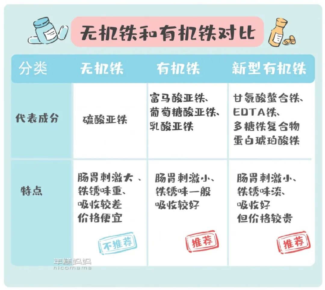 除了优先选择更易吸收的亚铁(2 价铁),市面上还分各种无机铁、有机铁,我们来看下区别——