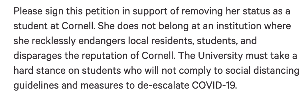 请签署这份请愿书以支持取消她在康奈尔大学的学生身份。她不属于康奈尔大学,因为她不顾一切地危害当地居民和学生,并贬低康奈尔的声誉。