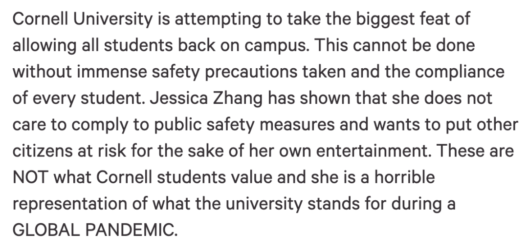 “康奈尔大学正在尽最大努力,使得几乎所有学生能够返回校园。但如果没有大量的安全预防措施和每个学生的遵守,这是不可能做到的。杰西卡·张的行为已经表现出她不愿意遵守公共安全措施,并且为了自己的娱乐而想把其他人置于危险之中。