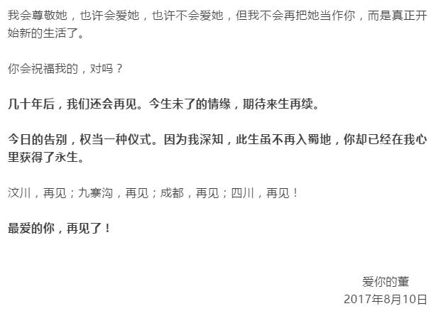 对不起,亲爱的宝贝。 对不起,我最爱的人。 身为家中独子,父母对我期望甚深。他们几番催促,苦苦相劝,白发横生,祖父病逝之前,仍记挂着我的婚事,我在病床前答应过他们,在38岁之前,一定圆了我的终身大事...... ...... 你会祝福我的,对吗? 几十年后,我们还会再见。今生未了的情缘,期待来生再续。 今日的告别,权当一种仪式。因为我深知,此生虽不再入蜀地,你却已经在我心里获得了永生。