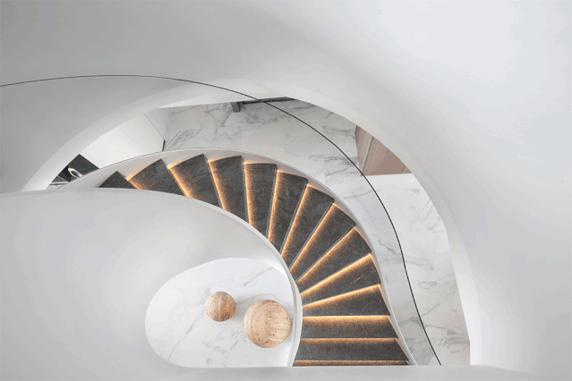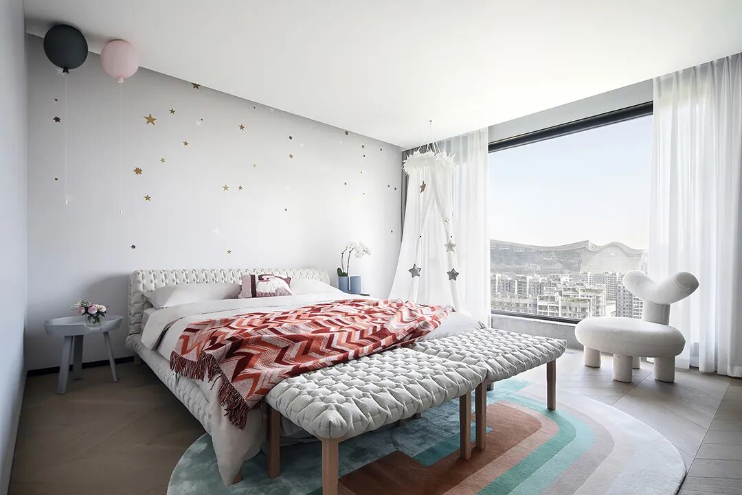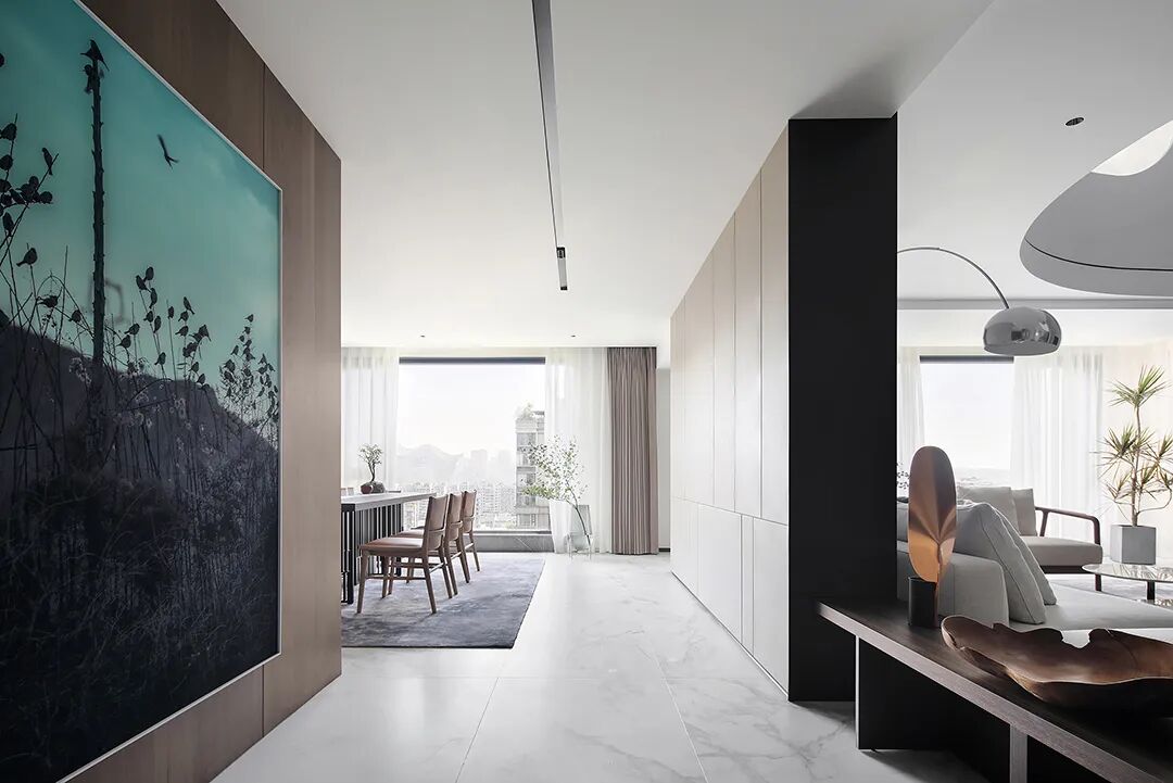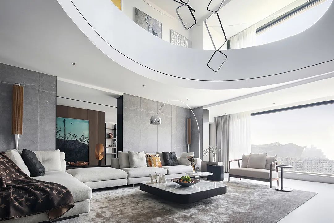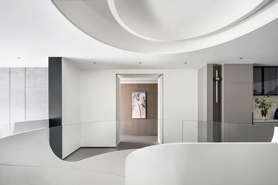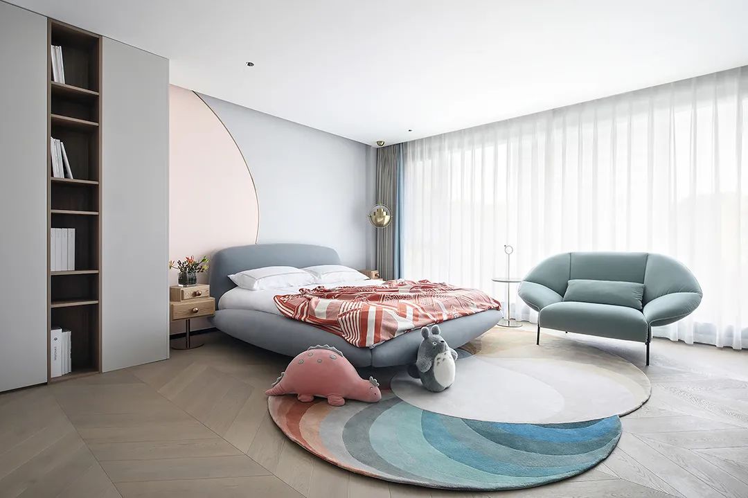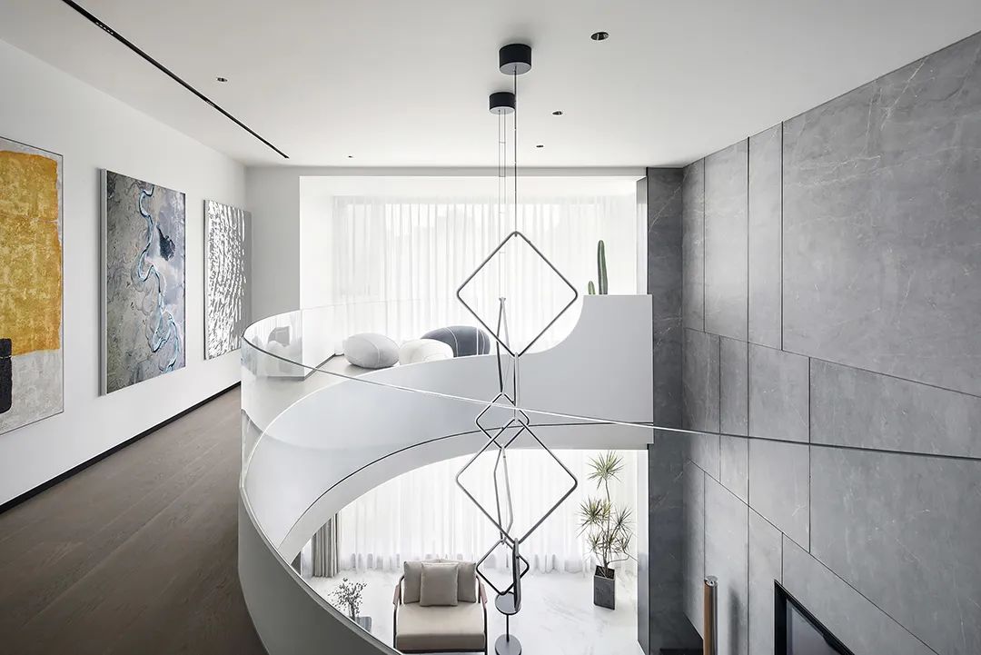 设计师将楼梯的位置移到客厅正中心,在原有挑空的基础上进行了合理搭建。让楼梯成为一首优雅流动的美妙乐章中的最美和弦,视觉上充满艺术的冲击力与感染力,结构上又真正起到了枢纽的作用。来自比利时的GARDECO青铜雕塑,自由展翼的造型与流动的楼梯形成呼应,荡起有一股灵动之姿。在重新规划的空间结构之下,设计师解决了后勤空间的局促与平面化的难题,将洗衣房、保姆房、晾晒房进行了合理的规划与整合,更好的满足了业主的诉求。拾级而上,梯步宛若琴键,蜿蜒的艺术几何,因灯光的明灭而表情丰富、顾盼生姿。灯光未亮时,安静优雅;灯光亮起时,简洁干净、艺术优雅的底色之下,温暖的生命亦随之缓归而来。内敛有序的灯光,用自己的语言诠释着空间的可能性。无论是自然光还是灯光,都因为光的光明、希望寓意,而成为设计中最值得期待的部分。理想中的家,应该像隐形的臂弯,揽每一个天涯倦客入怀,温吞的不紧不慢的氛围在四周慢慢发酵,在其中,人可以自由地呼吸,愉悦的通感,诗不必远方,心安之初便无需四处寻找。将阻碍视线的边界打通之后,整个客厅显得大气磅礴。窗外的城市景色尽收眼底。布局的简约之中,又透露着非凡品质。优雅的弧形使空间丰润有度,像画笔一般轻盈游走,柔美艺术,灵动十足。每一处饰物,都各得其所,诉说着自己的光阴故事,展现着美好生活所应该具备的每一个细节元素。纵深通透的客厅并非乏味得一览无余,而是在“似断非断”、“似隔非隔”的张力下独具魅力。穿过客厅可以直接望到茶书房,空间的立体层次,让人在其中行走的动线更加自由而灵活。金选民摄影作品《暇》,充满着自然的生机与质地,其蓝绿色的着墨与入户处的蓝色瞳眸在色彩上交相呼应。餐厨空间,也在立体的空间布局中,与其他空间互通,在尺度视野上得到了拉伸与拓展。与此同时,圆形的巧妙运用,亦呼应并延续了空间的主题,圆满和谐,丰润柔和。从二楼原有的挑空空间拓展开去,成为了现在业主私人的“艺术长廊”,这里陈列着业主的艺术收藏品。漫步其中,便可以细细品味每一处收藏,享受艺术带来的精神愉悦与满足。俏皮清新的家庭厅,有颜有趣,作为一家人休闲与交流情感的场所,这里的配色也都显得轻松活泼,满载温情,让一家人在闲暇时可以静享欢乐的亲子时光。卧室作为休憩的场所,又因不同的居住者属性而拥有不同的布置与个性。双主卧的设置,颇具质感,收纳合理,格调开阔,为人提供了独处与放空的私密空间。床头陈万毅的画作《太湖石》则为空间增添了些许艺术气息。与双主卧相比,客房则偏于简洁明朗、清新雅致。瓶盏绿植的点染,为平静的空间带来几分活力。为了满足业主的诉求,设计师为业主的两个女儿都设计了完整的套房。儿童房套房的打造,可以让女儿们的生活与学习更加便利。低饱和度的斑斓色彩盛载着女孩们糖果般的梦,憨萌的毛绒玩具、童趣写意的家具,美好温软,审美品位从小抓起。公主般的帐幔小心翼翼地呵护着孩童的天真幻想,带给她们无忧无虑的童年如花笑靥。灵动合理的改造,让整个空间焕然重生。在通透畅达的视野之下,重建了层次分明的立体秩序,让空间为我所用,不仅解决了原有空间局促、平面化的难题, 更为美好生活的延续与传递提供了更多的可能。秩序之下,通过艺术几何与线形的勾勒,很好地连接了人的情感共容,契合了业主的精神诉求,艺术简雅、丰富丰润,为居住带来了赏心悦目、抚慰心灵的绝佳体验,让家真正地成为了温情自在的精神港湾。