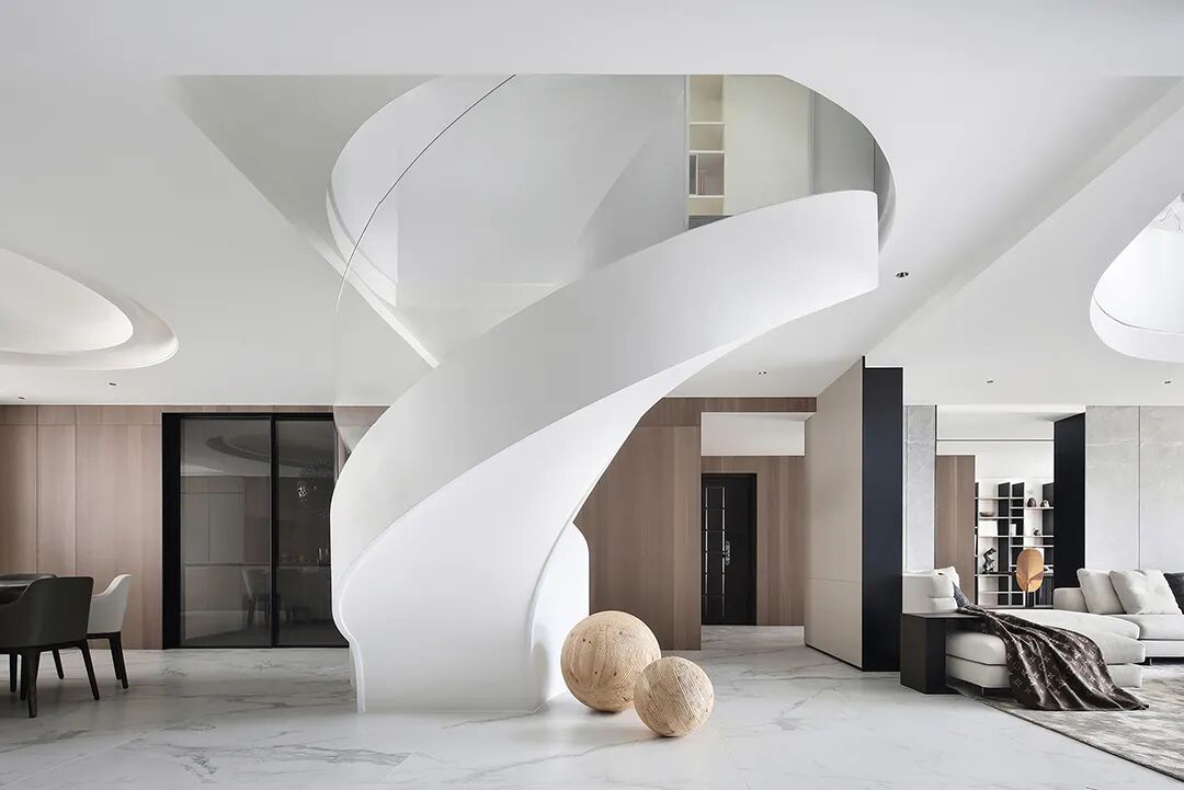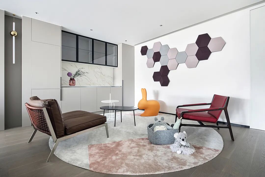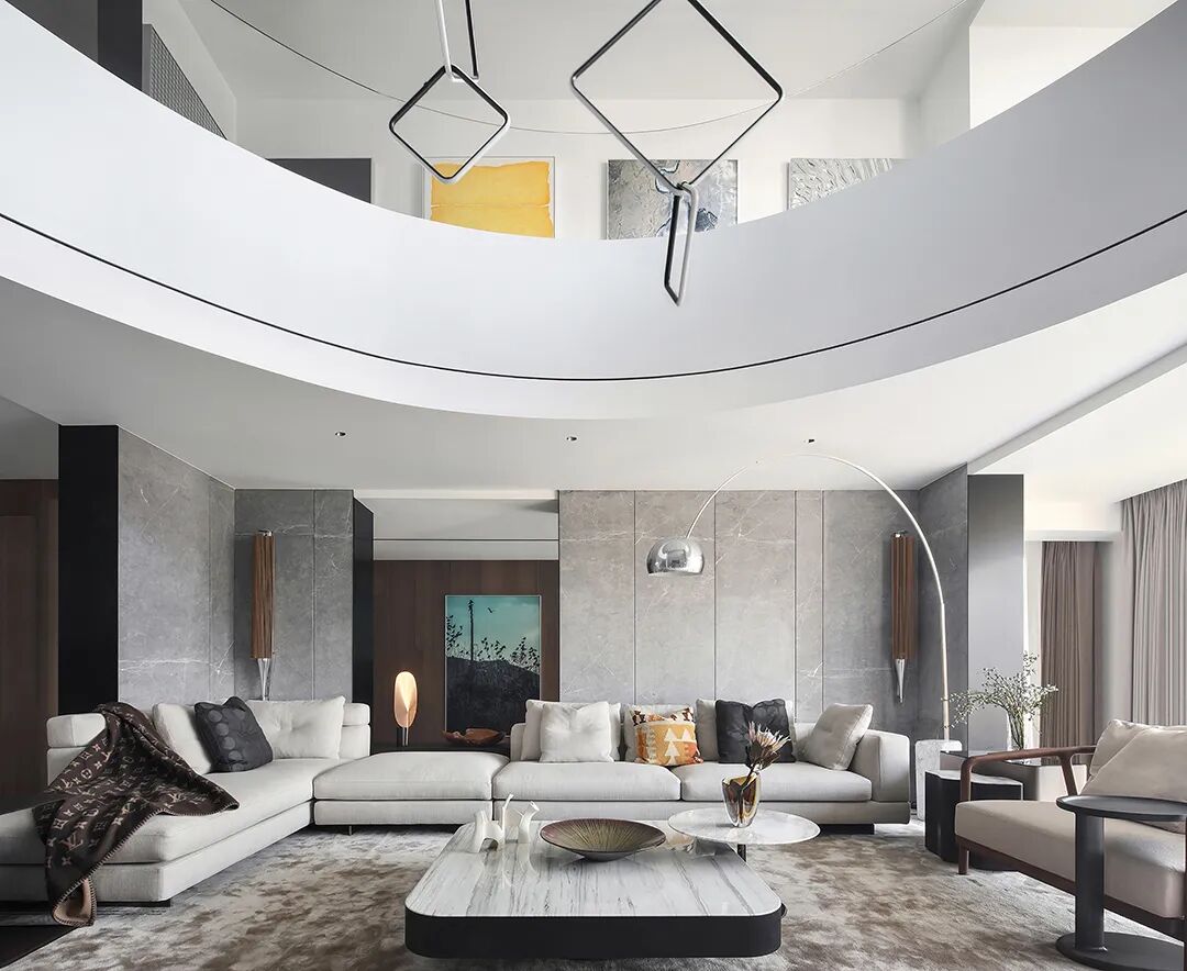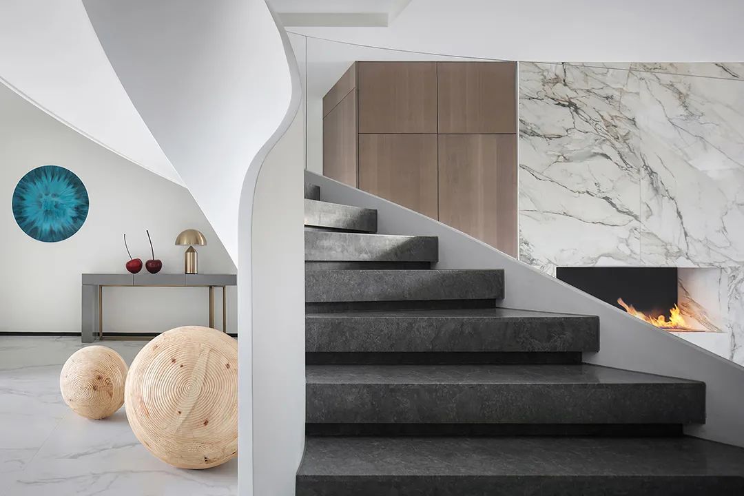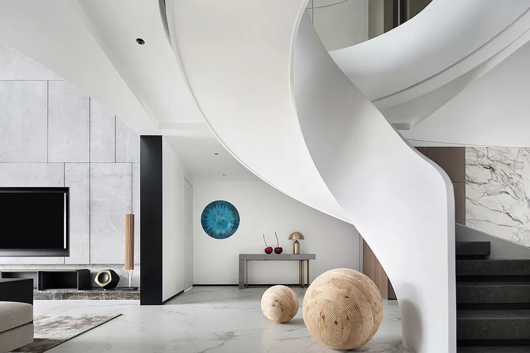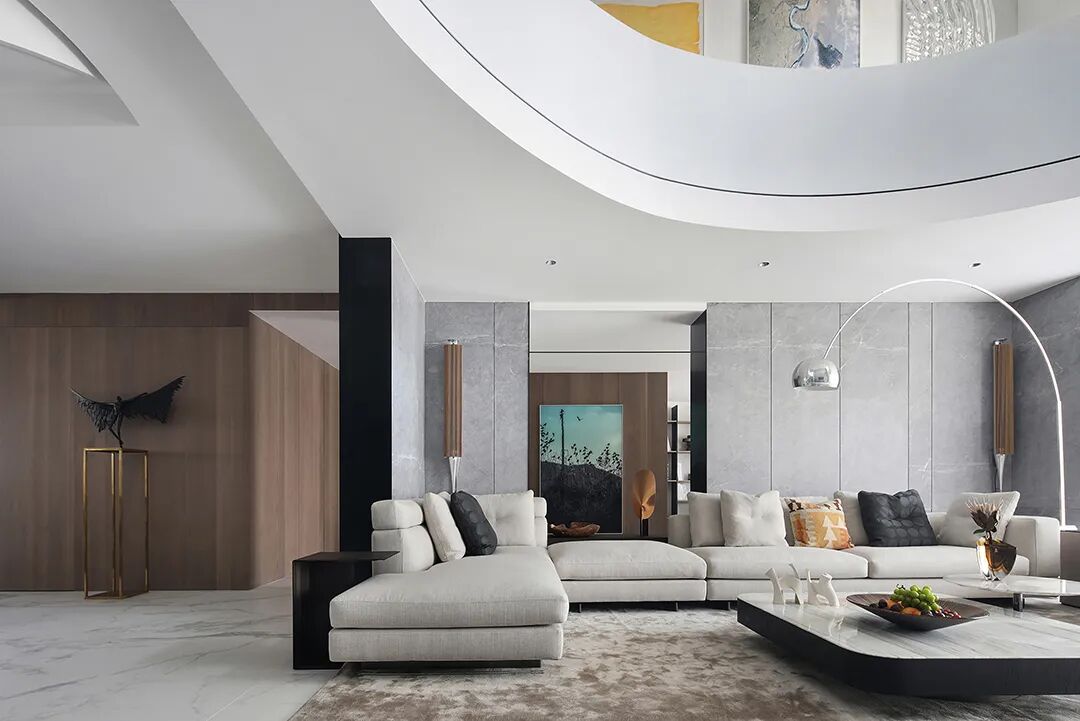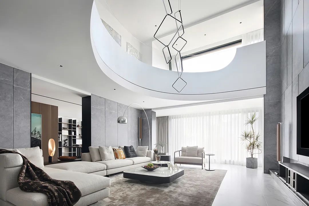设计师将楼梯的位置移到客厅正中心,在原有挑空的基础上进行了合理搭建。让楼梯成为一首优雅流动的美妙乐章中的最美和弦,视觉上充满艺术的冲击力与感染力,结构上又真正起到了枢纽的作用。来自比利时的GARDECO青铜雕塑,自由展翼的造型与流动的楼梯形成呼应,荡起有一股灵动之姿。在重新规划的空间结构之下,设计师解决了后勤空间的局促与平面化的难题,将洗衣房、保姆房、晾晒房进行了合理的规划与整合,更好的满足了业主的诉求。拾级而上,梯步宛若琴键,蜿蜒的艺术几何,因灯光的明灭而表情丰富、顾盼生姿。灯光未亮时,安静优雅;灯光亮起时,简洁干净、艺术优雅的底色之下,温暖的生命亦随之缓归而来。内敛有序的灯光,用自己的语言诠释着空间的可能性。无论是自然光还是灯光,都因为光的光明、希望寓意,而成为设计中最值得期待的部分。理想中的家,应该像隐形的臂弯,揽每一个天涯倦客入怀,温吞的不紧不慢的氛围在四周慢慢发酵,在其中,人可以自由地呼吸,愉悦的通感,诗不必远方,心安之初便无需四处寻找。将阻碍视线的边界打通之后,整个客厅显得大气磅礴。窗外的城市景色尽收眼底。布局的简约之中,又透露着非凡品质。优雅的弧形使空间丰润有度,像画笔一般轻盈游走,柔美艺术,灵动十足。每一处饰物,都各得其所,诉说着自己的光阴故事,展现着美好生活所应该具备的每一个细节元素。纵深通透的客厅并非乏味得一览无余,而是在“似断非断”、“似隔非隔”的张力下独具魅力。穿过客厅可以直接望到茶书房,空间的立体层次,让人在其中行走的动线更加自由而灵活。金选民摄影作品《暇》,充满着自然的生机与质地,其蓝绿色的着墨与入户处的蓝色瞳眸在色彩上交相呼应。餐厨空间,也在立体的空间布局中,与其他空间互通,在尺度视野上得到了拉伸与拓展。与此同时,圆形的巧妙运用,亦呼应并延续了空间的主题,圆满和谐,丰润柔和。从二楼原有的挑空空间拓展开去,成为了现在业主私人的“艺术长廊”,这里陈列着业主的艺术收藏品。漫步其中,便可以细细品味每一处收藏,享受艺术带来的精神愉悦与满足。俏皮清新的家庭厅,有颜有趣,作为一家人休闲与交流情感的场所,这里的配色也都显得轻松活泼,满载温情,让一家人在闲暇时可以静享欢乐的亲子时光。卧室作为休憩的场所,又因不同的居住者属性而拥有不同的布置与个性。双主卧的设置,颇具质感,收纳合理,格调开阔,为人提供了独处与放空的私密空间。床头陈万毅的画作《太湖石》则为空间增添了些许艺术气息。与双主卧相比,客房则偏于简洁明朗、清新雅致。瓶盏绿植的点染,为平静的空间带来几分活力。为了满足业主的诉求,设计师为业主的两个女儿都设计了完整的套房。儿童房套房的打造,可以让女儿们的生活与学习更加便利。低饱和度的斑斓色彩盛载着女孩们糖果般的梦,憨萌的毛绒玩具、童趣写意的家具,美好温软,审美品位从小抓起。公主般的帐幔小心翼翼地呵护着孩童的天真幻想,带给她们无忧无虑的童年如花笑靥。灵动合理的改造,让整个空间焕然重生。在通透畅达的视野之下,重建了层次分明的立体秩序,让空间为我所用,不仅解决了原有空间局促、平面化的难题, 更为美好生活的延续与传递提供了更多的可能。秩序之下,通过艺术几何与线形的勾勒,很好地连接了人的情感共容,契合了业主的精神诉求,艺术简雅、丰富丰润,为居住带来了赏心悦目、抚慰心灵的绝佳体验,让家真正地成为了温情自在的精神港湾。