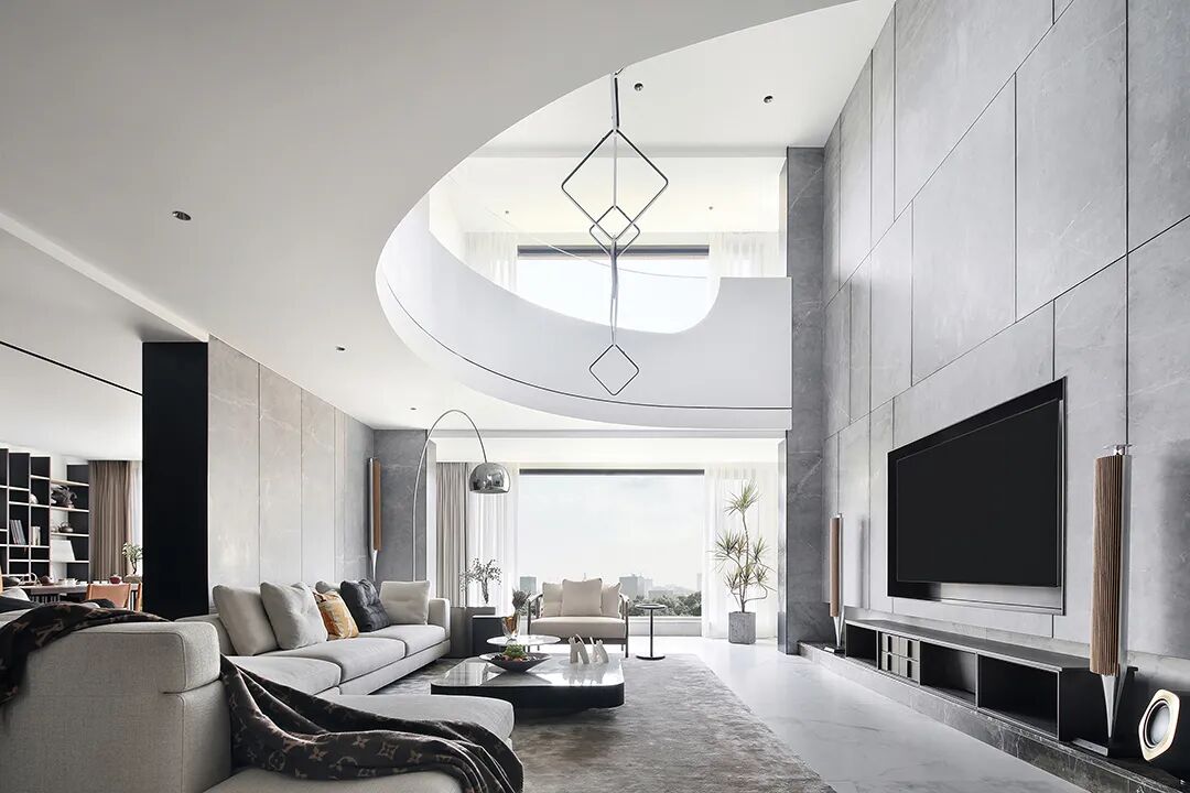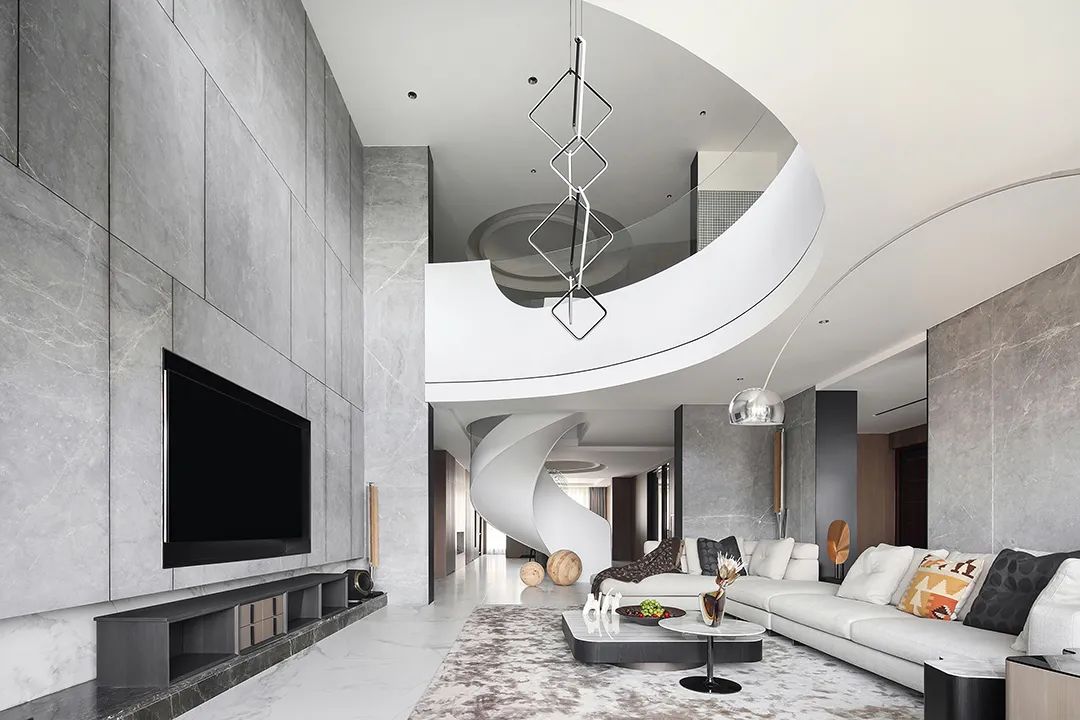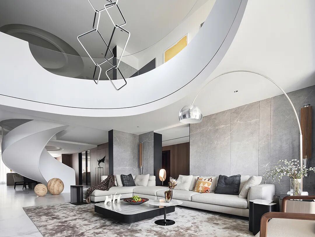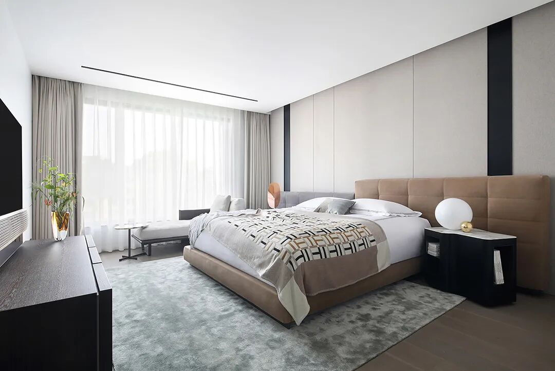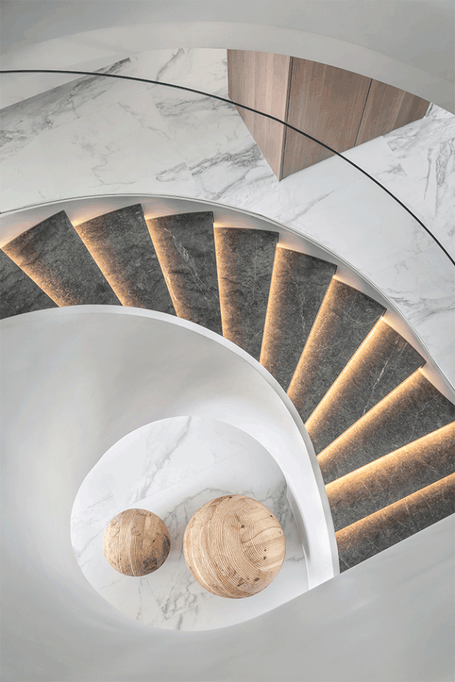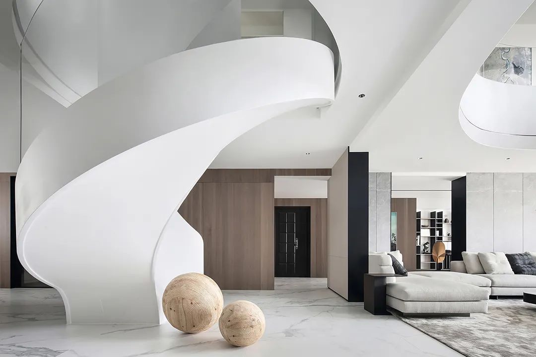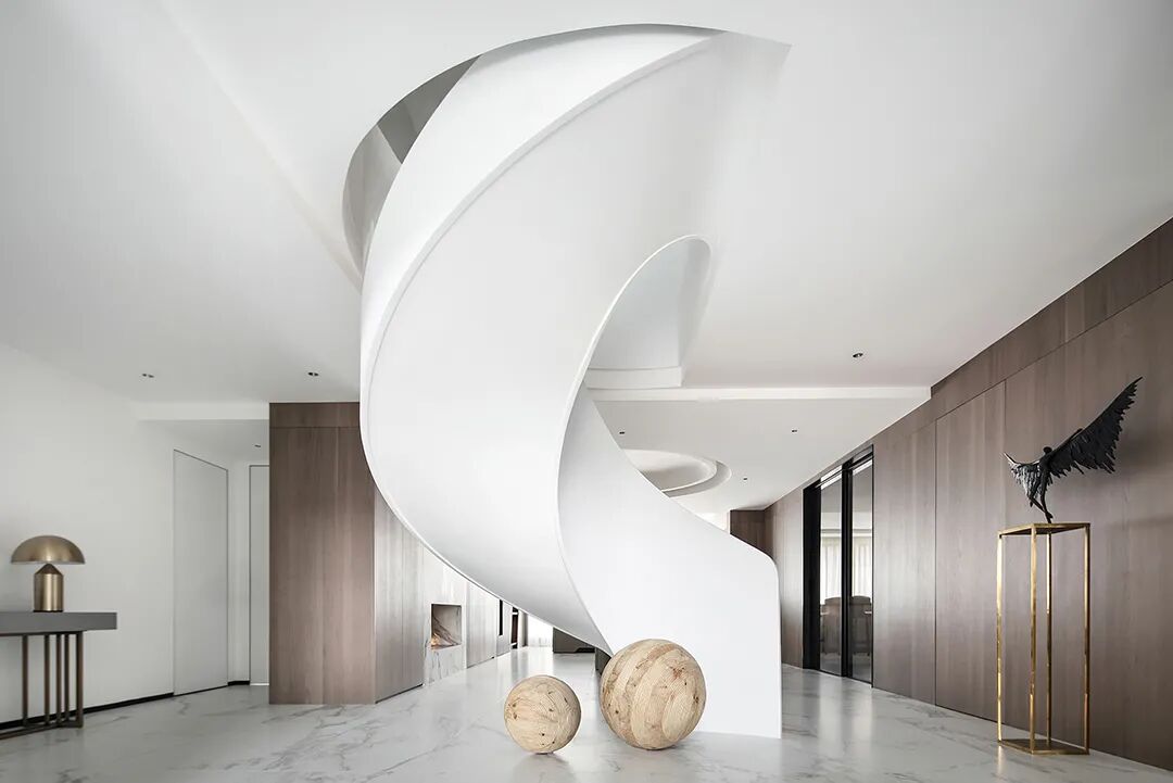 设计师将楼梯的位置移到客厅正中心,在原有挑空的基础上进行了合理搭建。让楼梯成为一首优雅流动的美妙乐章中的最美和弦,视觉上充满艺术的冲击力与感染力,结构上又真正起到了枢纽的作用。来自比利时的GARDECO青铜雕塑,自由展翼的造型与流动的楼梯形成呼应,荡起有一股灵动之姿。在重新规划的空间结构之下,设计师解决了后勤空间的局促与平面化的难题,将洗衣房、保姆房、晾晒房进行了合理的规划与整合,更好的满足了业主的诉求。拾级而上,梯步宛若琴键,蜿蜒的艺术几何,因灯光的明灭而表情丰富、顾盼生姿。灯光未亮时,安静优雅;灯光亮起时,简洁干净、艺术优雅的底色之下,温暖的生命亦随之缓归而来。内敛有序的灯光,用自己的语言诠释着空间的可能性。无论是自然光还是灯光,都因为光的光明、希望寓意,而成为设计中最值得期待的部分。理想中的家,应该像隐形的臂弯,揽每一个天涯倦客入怀,温吞的不紧不慢的氛围在四周慢慢发酵,在其中,人可以自由地呼吸,愉悦的通感,诗不必远方,心安之初便无需四处寻找。将阻碍视线的边界打通之后,整个客厅显得大气磅礴。窗外的城市景色尽收眼底。布局的简约之中,又透露着非凡品质。优雅的弧形使空间丰润有度,像画笔一般轻盈游走,柔美艺术,灵动十足。每一处饰物,都各得其所,诉说着自己的光阴故事,展现着美好生活所应该具备的每一个细节元素。纵深通透的客厅并非乏味得一览无余,而是在“似断非断”、“似隔非隔”的张力下独具魅力。穿过客厅可以直接望到茶书房,空间的立体层次,让人在其中行走的动线更加自由而灵活。金选民摄影作品《暇》,充满着自然的生机与质地,其蓝绿色的着墨与入户处的蓝色瞳眸在色彩上交相呼应。餐厨空间,也在立体的空间布局中,与其他空间互通,在尺度视野上得到了拉伸与拓展。与此同时,圆形的巧妙运用,亦呼应并延续了空间的主题,圆满和谐,丰润柔和。从二楼原有的挑空空间拓展开去,成为了现在业主私人的“艺术长廊”,这里陈列着业主的艺术收藏品。漫步其中,便可以细细品味每一处收藏,享受艺术带来的精神愉悦与满足。俏皮清新的家庭厅,有颜有趣,作为一家人休闲与交流情感的场所,这里的配色也都显得轻松活泼,满载温情,让一家人在闲暇时可以静享欢乐的亲子时光。卧室作为休憩的场所,又因不同的居住者属性而拥有不同的布置与个性。双主卧的设置,颇具质感,收纳合理,格调开阔,为人提供了独处与放空的私密空间。床头陈万毅的画作《太湖石》则为空间增添了些许艺术气息。与双主卧相比,客房则偏于简洁明朗、清新雅致。瓶盏绿植的点染,为平静的空间带来几分活力。为了满足业主的诉求,设计师为业主的两个女儿都设计了完整的套房。儿童房套房的打造,可以让女儿们的生活与学习更加便利。低饱和度的斑斓色彩盛载着女孩们糖果般的梦,憨萌的毛绒玩具、童趣写意的家具,美好温软,审美品位从小抓起。公主般的帐幔小心翼翼地呵护着孩童的天真幻想,带给她们无忧无虑的童年如花笑靥。灵动合理的改造,让整个空间焕然重生。在通透畅达的视野之下,重建了层次分明的立体秩序,让空间为我所用,不仅解决了原有空间局促、平面化的难题, 更为美好生活的延续与传递提供了更多的可能。秩序之下,通过艺术几何与线形的勾勒,很好地连接了人的情感共容,契合了业主的精神诉求,艺术简雅、丰富丰润,为居住带来了赏心悦目、抚慰心灵的绝佳体验,让家真正地成为了温情自在的精神港湾。