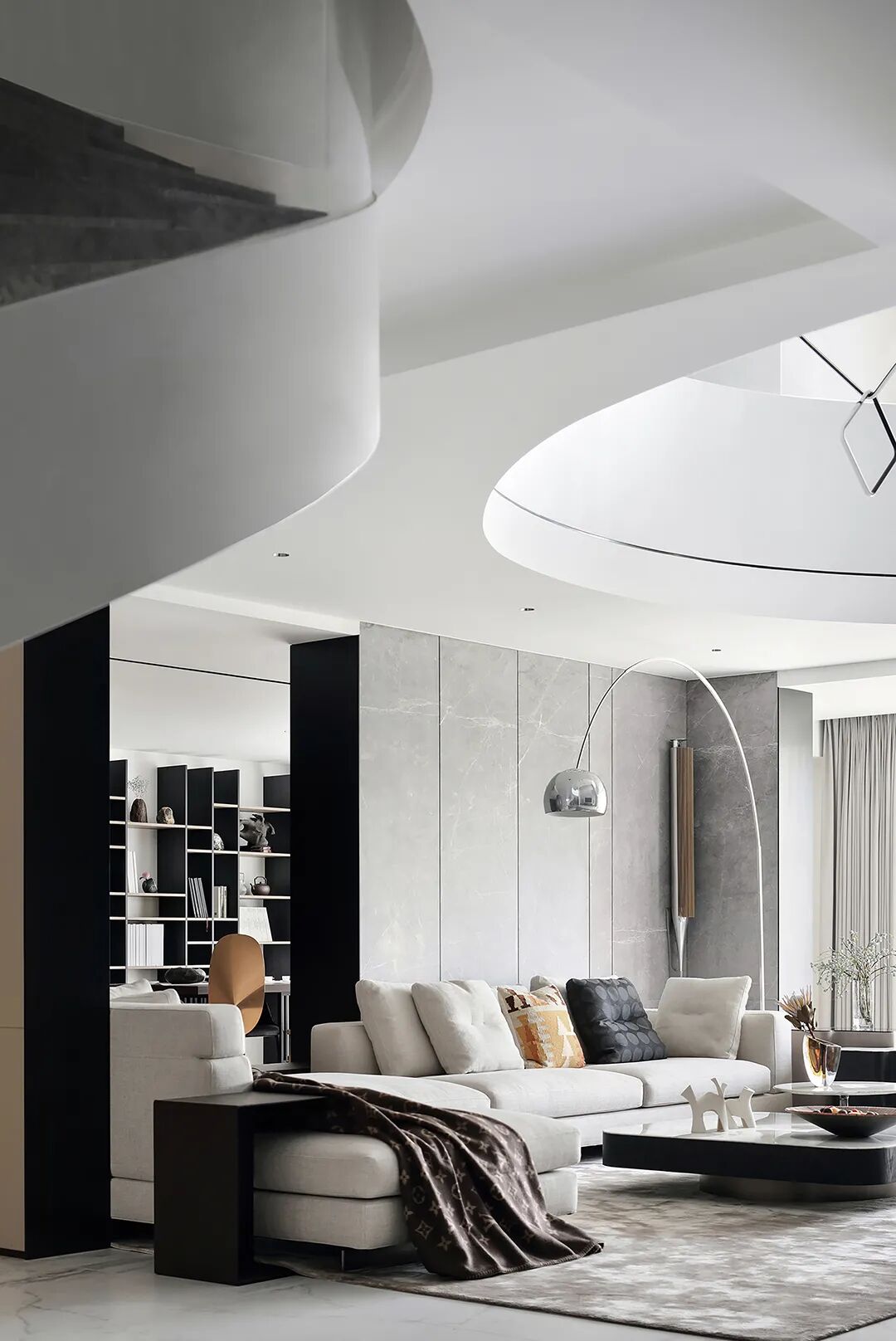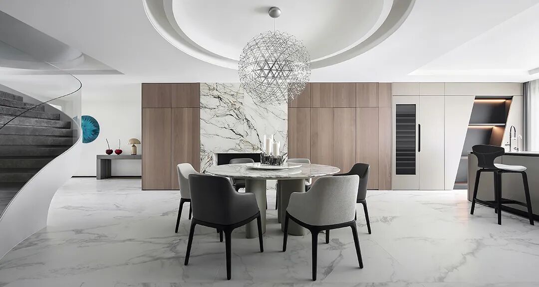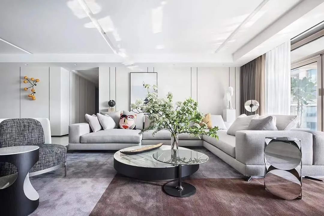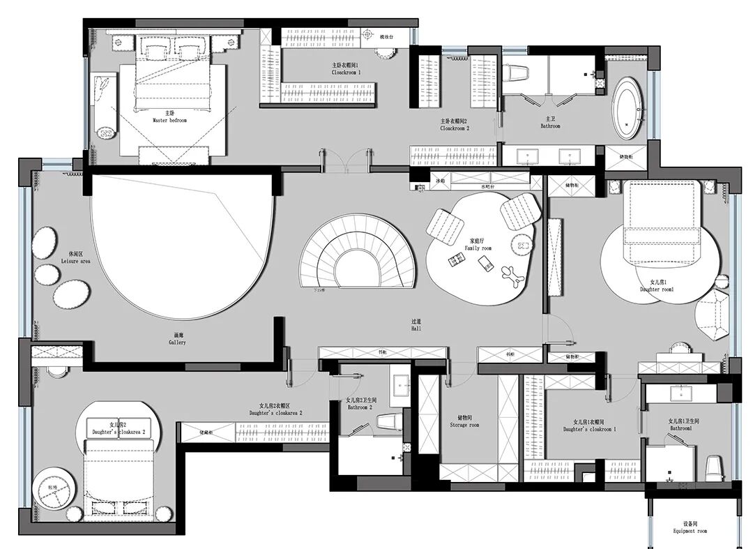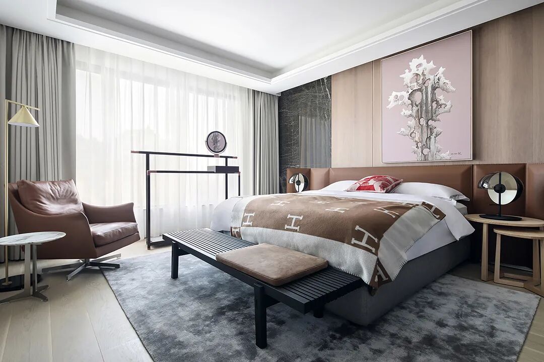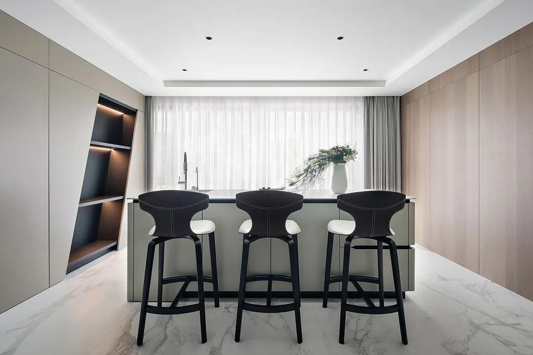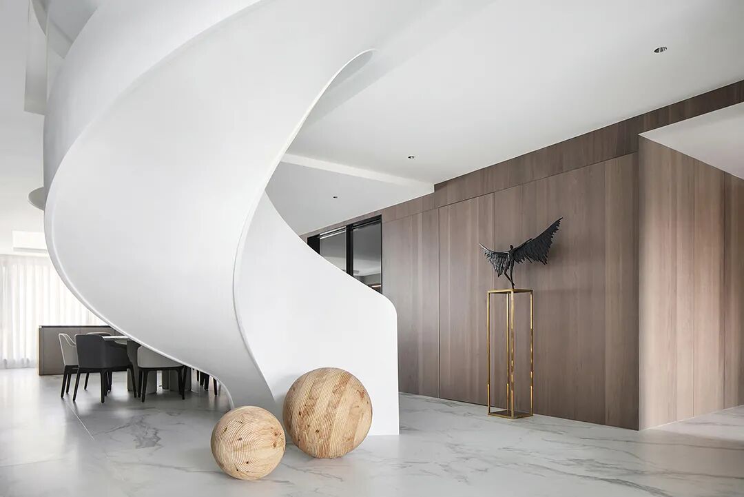 设计师将楼梯的位置移到客厅正中心,在原有挑空的基础上进行了合理搭建。让楼梯成为一首优雅流动的美妙乐章中的最美和弦,视觉上充满艺术的冲击力与感染力,结构上又真正起到了枢纽的作用。来自比利时的GARDECO青铜雕塑,自由展翼的造型与流动的楼梯形成呼应,荡起有一股灵动之姿。在重新规划的空间结构之下,设计师解决了后勤空间的局促与平面化的难题,将洗衣房、保姆房、晾晒房进行了合理的规划与整合,更好的满足了业主的诉求。拾级而上,梯步宛若琴键,蜿蜒的艺术几何,因灯光的明灭而表情丰富、顾盼生姿。灯光未亮时,安静优雅;灯光亮起时,简洁干净、艺术优雅的底色之下,温暖的生命亦随之缓归而来。内敛有序的灯光,用自己的语言诠释着空间的可能性。无论是自然光还是灯光,都因为光的光明、希望寓意,而成为设计中最值得期待的部分。理想中的家,应该像隐形的臂弯,揽每一个天涯倦客入怀,温吞的不紧不慢的氛围在四周慢慢发酵,在其中,人可以自由地呼吸,愉悦的通感,诗不必远方,心安之初便无需四处寻找。将阻碍视线的边界打通之后,整个客厅显得大气磅礴。窗外的城市景色尽收眼底。布局的简约之中,又透露着非凡品质。优雅的弧形使空间丰润有度,像画笔一般轻盈游走,柔美艺术,灵动十足。每一处饰物,都各得其所,诉说着自己的光阴故事,展现着美好生活所应该具备的每一个细节元素。纵深通透的客厅并非乏味得一览无余,而是在“似断非断”、“似隔非隔”的张力下独具魅力。穿过客厅可以直接望到茶书房,空间的立体层次,让人在其中行走的动线更加自由而灵活。金选民摄影作品《暇》,充满着自然的生机与质地,其蓝绿色的着墨与入户处的蓝色瞳眸在色彩上交相呼应。餐厨空间,也在立体的空间布局中,与其他空间互通,在尺度视野上得到了拉伸与拓展。与此同时,圆形的巧妙运用,亦呼应并延续了空间的主题,圆满和谐,丰润柔和。从二楼原有的挑空空间拓展开去,成为了现在业主私人的“艺术长廊”,这里陈列着业主的艺术收藏品。漫步其中,便可以细细品味每一处收藏,享受艺术带来的精神愉悦与满足。俏皮清新的家庭厅,有颜有趣,作为一家人休闲与交流情感的场所,这里的配色也都显得轻松活泼,满载温情,让一家人在闲暇时可以静享欢乐的亲子时光。卧室作为休憩的场所,又因不同的居住者属性而拥有不同的布置与个性。双主卧的设置,颇具质感,收纳合理,格调开阔,为人提供了独处与放空的私密空间。床头陈万毅的画作《太湖石》则为空间增添了些许艺术气息。与双主卧相比,客房则偏于简洁明朗、清新雅致。瓶盏绿植的点染,为平静的空间带来几分活力。为了满足业主的诉求,设计师为业主的两个女儿都设计了完整的套房。儿童房套房的打造,可以让女儿们的生活与学习更加便利。低饱和度的斑斓色彩盛载着女孩们糖果般的梦,憨萌的毛绒玩具、童趣写意的家具,美好温软,审美品位从小抓起。公主般的帐幔小心翼翼地呵护着孩童的天真幻想,带给她们无忧无虑的童年如花笑靥。灵动合理的改造,让整个空间焕然重生。在通透畅达的视野之下,重建了层次分明的立体秩序,让空间为我所用,不仅解决了原有空间局促、平面化的难题, 更为美好生活的延续与传递提供了更多的可能。秩序之下,通过艺术几何与线形的勾勒,很好地连接了人的情感共容,契合了业主的精神诉求,艺术简雅、丰富丰润,为居住带来了赏心悦目、抚慰心灵的绝佳体验,让家真正地成为了温情自在的精神港湾。