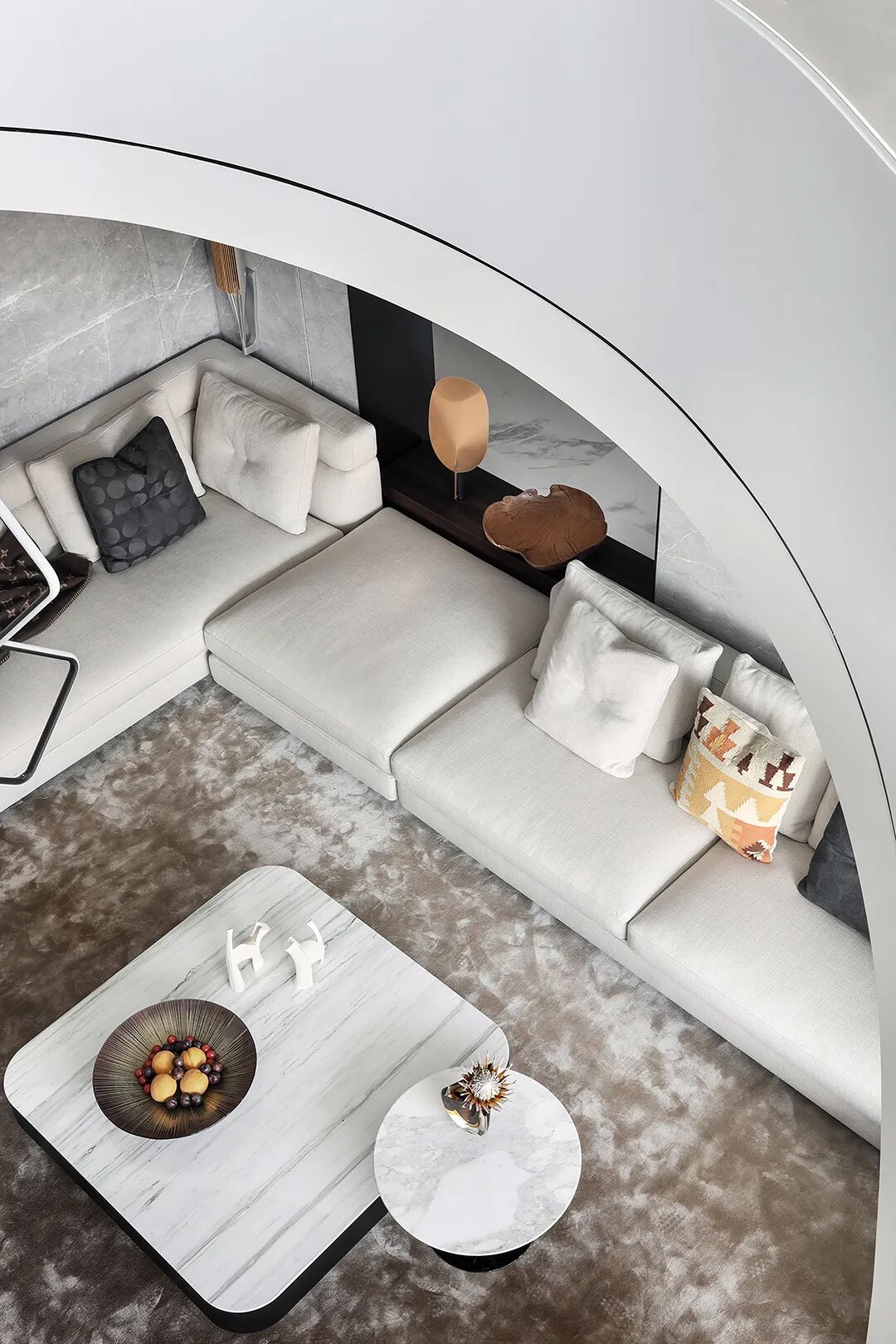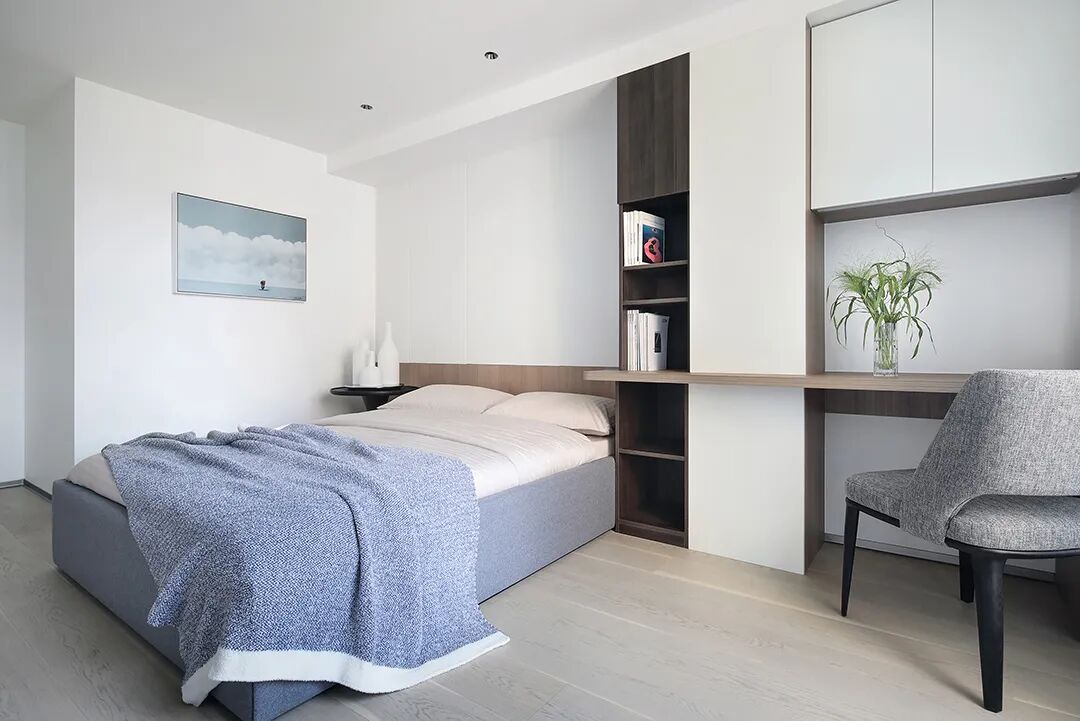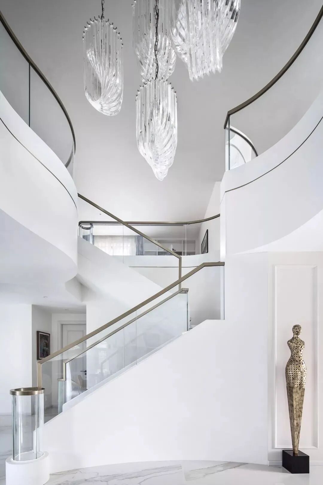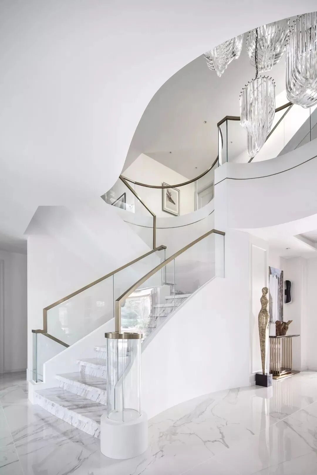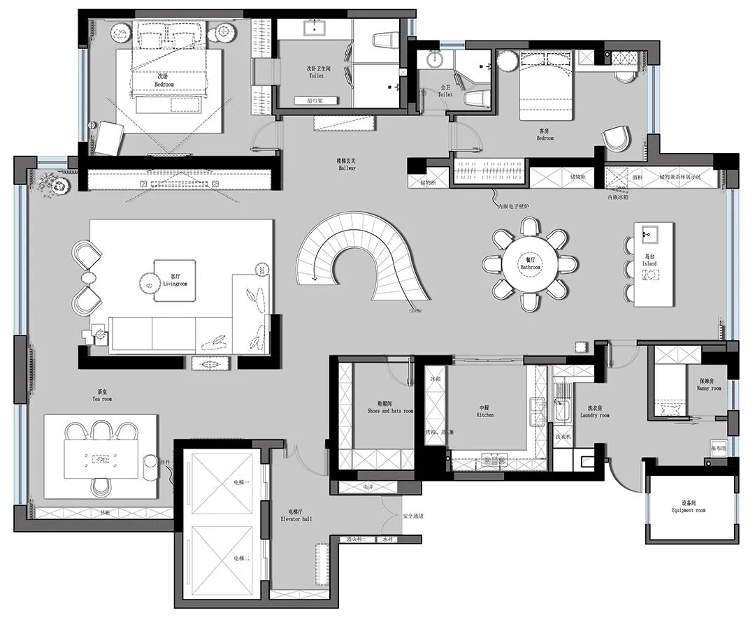 设计师将楼梯的位置移到客厅正中心,在原有挑空的基础上进行了合理搭建。让楼梯成为一首优雅流动的美妙乐章中的最美和弦,视觉上充满艺术的冲击力与感染力,结构上又真正起到了枢纽的作用。来自比利时的GARDECO青铜雕塑,自由展翼的造型与流动的楼梯形成呼应,荡起有一股灵动之姿。在重新规划的空间结构之下,设计师解决了后勤空间的局促与平面化的难题,将洗衣房、保姆房、晾晒房进行了合理的规划与整合,更好的满足了业主的诉求。拾级而上,梯步宛若琴键,蜿蜒的艺术几何,因灯光的明灭而表情丰富、顾盼生姿。灯光未亮时,安静优雅;灯光亮起时,简洁干净、艺术优雅的底色之下,温暖的生命亦随之缓归而来。内敛有序的灯光,用自己的语言诠释着空间的可能性。无论是自然光还是灯光,都因为光的光明、希望寓意,而成为设计中最值得期待的部分。理想中的家,应该像隐形的臂弯,揽每一个天涯倦客入怀,温吞的不紧不慢的氛围在四周慢慢发酵,在其中,人可以自由地呼吸,愉悦的通感,诗不必远方,心安之初便无需四处寻找。将阻碍视线的边界打通之后,整个客厅显得大气磅礴。窗外的城市景色尽收眼底。布局的简约之中,又透露着非凡品质。优雅的弧形使空间丰润有度,像画笔一般轻盈游走,柔美艺术,灵动十足。每一处饰物,都各得其所,诉说着自己的光阴故事,展现着美好生活所应该具备的每一个细节元素。纵深通透的客厅并非乏味得一览无余,而是在“似断非断”、“似隔非隔”的张力下独具魅力。穿过客厅可以直接望到茶书房,空间的立体层次,让人在其中行走的动线更加自由而灵活。金选民摄影作品《暇》,充满着自然的生机与质地,其蓝绿色的着墨与入户处的蓝色瞳眸在色彩上交相呼应。餐厨空间,也在立体的空间布局中,与其他空间互通,在尺度视野上得到了拉伸与拓展。与此同时,圆形的巧妙运用,亦呼应并延续了空间的主题,圆满和谐,丰润柔和。从二楼原有的挑空空间拓展开去,成为了现在业主私人的“艺术长廊”,这里陈列着业主的艺术收藏品。漫步其中,便可以细细品味每一处收藏,享受艺术带来的精神愉悦与满足。俏皮清新的家庭厅,有颜有趣,作为一家人休闲与交流情感的场所,这里的配色也都显得轻松活泼,满载温情,让一家人在闲暇时可以静享欢乐的亲子时光。卧室作为休憩的场所,又因不同的居住者属性而拥有不同的布置与个性。双主卧的设置,颇具质感,收纳合理,格调开阔,为人提供了独处与放空的私密空间。床头陈万毅的画作《太湖石》则为空间增添了些许艺术气息。与双主卧相比,客房则偏于简洁明朗、清新雅致。瓶盏绿植的点染,为平静的空间带来几分活力。为了满足业主的诉求,设计师为业主的两个女儿都设计了完整的套房。儿童房套房的打造,可以让女儿们的生活与学习更加便利。低饱和度的斑斓色彩盛载着女孩们糖果般的梦,憨萌的毛绒玩具、童趣写意的家具,美好温软,审美品位从小抓起。公主般的帐幔小心翼翼地呵护着孩童的天真幻想,带给她们无忧无虑的童年如花笑靥。灵动合理的改造,让整个空间焕然重生。在通透畅达的视野之下,重建了层次分明的立体秩序,让空间为我所用,不仅解决了原有空间局促、平面化的难题, 更为美好生活的延续与传递提供了更多的可能。秩序之下,通过艺术几何与线形的勾勒,很好地连接了人的情感共容,契合了业主的精神诉求,艺术简雅、丰富丰润,为居住带来了赏心悦目、抚慰心灵的绝佳体验,让家真正地成为了温情自在的精神港湾。