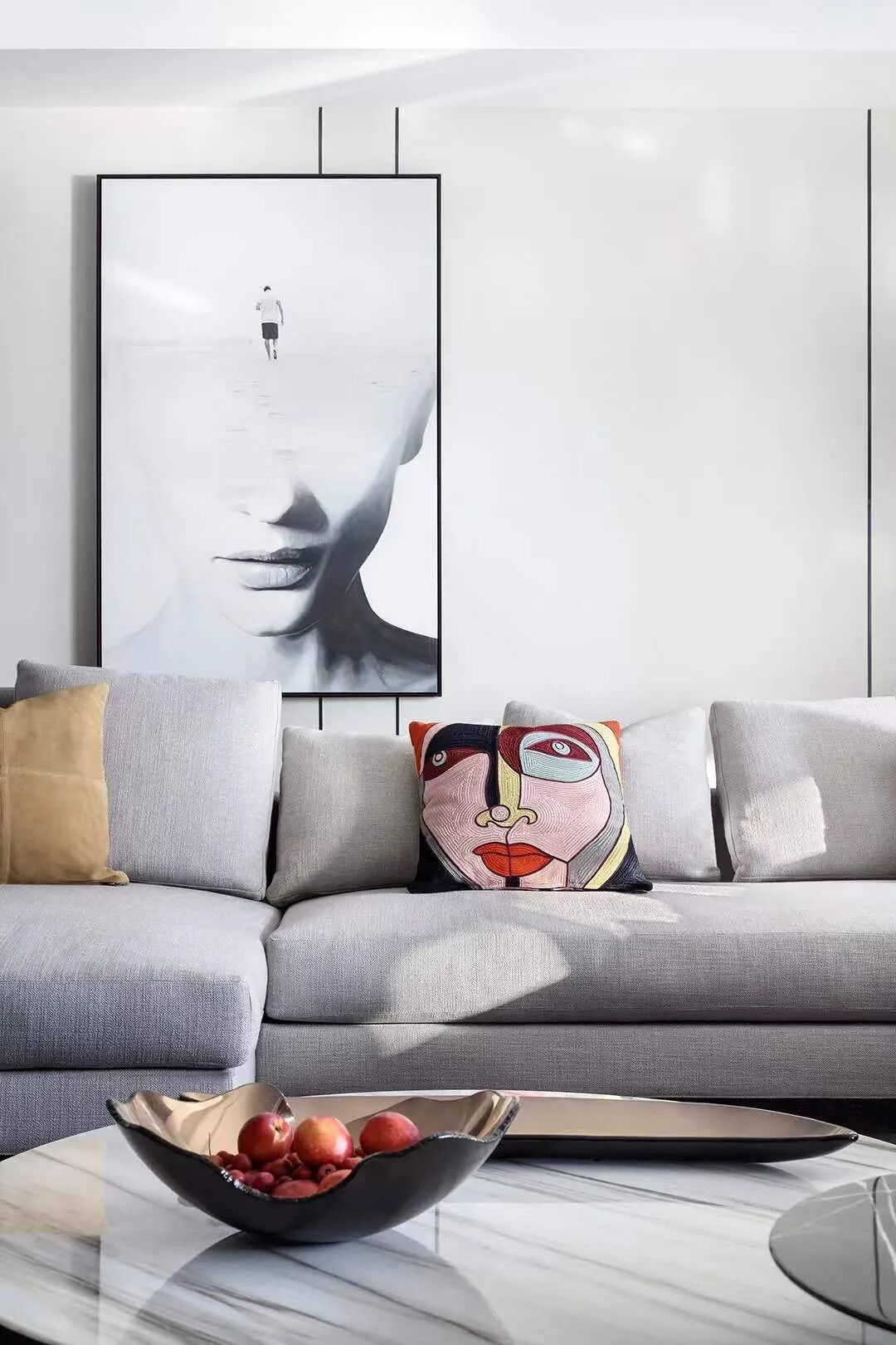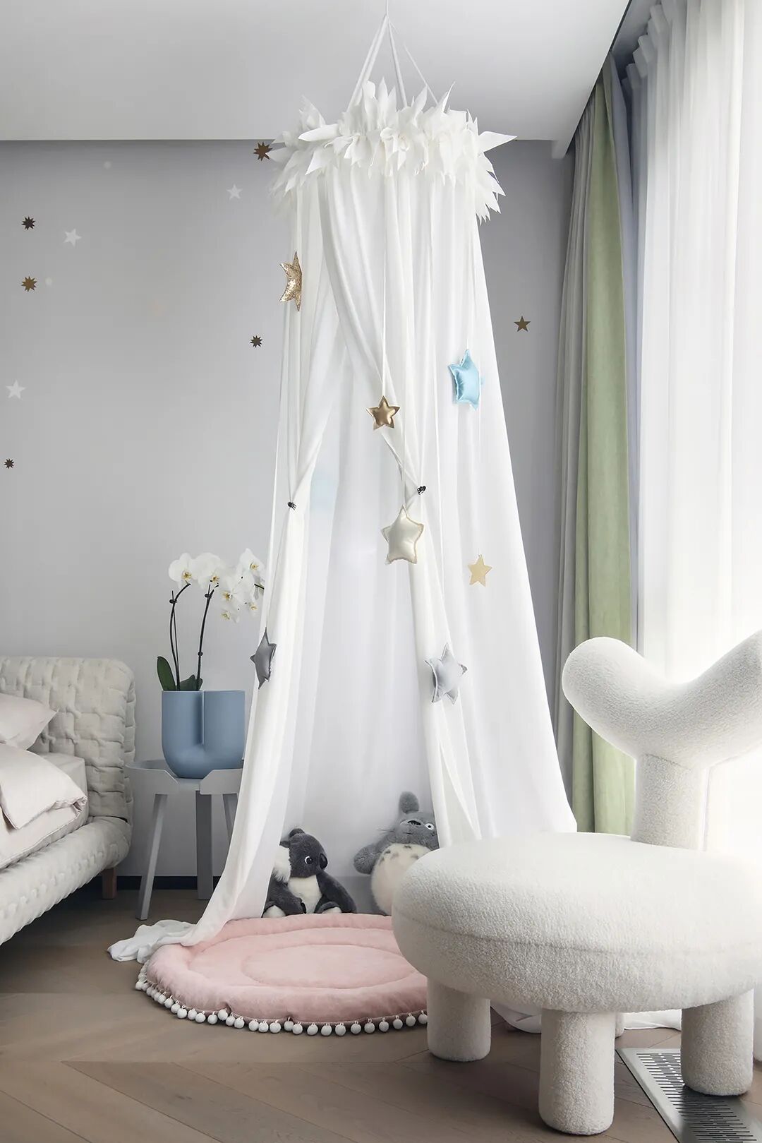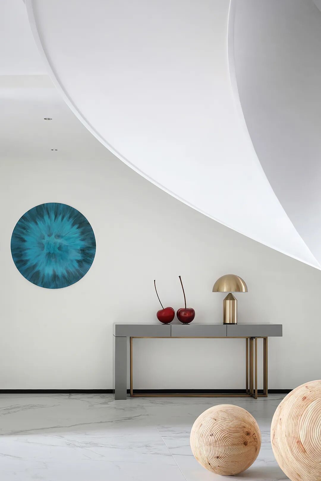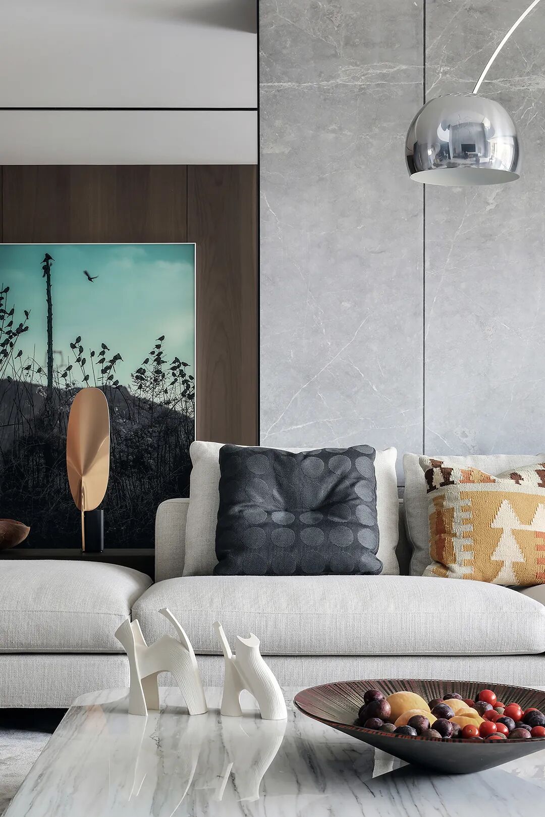 设计师将楼梯的位置移到客厅正中心,在原有挑空的基础上进行了合理搭建。让楼梯成为一首优雅流动的美妙乐章中的最美和弦,视觉上充满艺术的冲击力与感染力,结构上又真正起到了枢纽的作用。来自比利时的GARDECO青铜雕塑,自由展翼的造型与流动的楼梯形成呼应,荡起有一股灵动之姿。在重新规划的空间结构之下,设计师解决了后勤空间的局促与平面化的难题,将洗衣房、保姆房、晾晒房进行了合理的规划与整合,更好的满足了业主的诉求。拾级而上,梯步宛若琴键,蜿蜒的艺术几何,因灯光的明灭而表情丰富、顾盼生姿。灯光未亮时,安静优雅;灯光亮起时,简洁干净、艺术优雅的底色之下,温暖的生命亦随之缓归而来。内敛有序的灯光,用自己的语言诠释着空间的可能性。无论是自然光还是灯光,都因为光的光明、希望寓意,而成为设计中最值得期待的部分。理想中的家,应该像隐形的臂弯,揽每一个天涯倦客入怀,温吞的不紧不慢的氛围在四周慢慢发酵,在其中,人可以自由地呼吸,愉悦的通感,诗不必远方,心安之初便无需四处寻找。将阻碍视线的边界打通之后,整个客厅显得大气磅礴。窗外的城市景色尽收眼底。布局的简约之中,又透露着非凡品质。优雅的弧形使空间丰润有度,像画笔一般轻盈游走,柔美艺术,灵动十足。每一处饰物,都各得其所,诉说着自己的光阴故事,展现着美好生活所应该具备的每一个细节元素。纵深通透的客厅并非乏味得一览无余,而是在“似断非断”、“似隔非隔”的张力下独具魅力。穿过客厅可以直接望到茶书房,空间的立体层次,让人在其中行走的动线更加自由而灵活。金选民摄影作品《暇》,充满着自然的生机与质地,其蓝绿色的着墨与入户处的蓝色瞳眸在色彩上交相呼应。餐厨空间,也在立体的空间布局中,与其他空间互通,在尺度视野上得到了拉伸与拓展。与此同时,圆形的巧妙运用,亦呼应并延续了空间的主题,圆满和谐,丰润柔和。从二楼原有的挑空空间拓展开去,成为了现在业主私人的“艺术长廊”,这里陈列着业主的艺术收藏品。漫步其中,便可以细细品味每一处收藏,享受艺术带来的精神愉悦与满足。俏皮清新的家庭厅,有颜有趣,作为一家人休闲与交流情感的场所,这里的配色也都显得轻松活泼,满载温情,让一家人在闲暇时可以静享欢乐的亲子时光。卧室作为休憩的场所,又因不同的居住者属性而拥有不同的布置与个性。双主卧的设置,颇具质感,收纳合理,格调开阔,为人提供了独处与放空的私密空间。床头陈万毅的画作《太湖石》则为空间增添了些许艺术气息。与双主卧相比,客房则偏于简洁明朗、清新雅致。瓶盏绿植的点染,为平静的空间带来几分活力。为了满足业主的诉求,设计师为业主的两个女儿都设计了完整的套房。儿童房套房的打造,可以让女儿们的生活与学习更加便利。低饱和度的斑斓色彩盛载着女孩们糖果般的梦,憨萌的毛绒玩具、童趣写意的家具,美好温软,审美品位从小抓起。公主般的帐幔小心翼翼地呵护着孩童的天真幻想,带给她们无忧无虑的童年如花笑靥。灵动合理的改造,让整个空间焕然重生。在通透畅达的视野之下,重建了层次分明的立体秩序,让空间为我所用,不仅解决了原有空间局促、平面化的难题, 更为美好生活的延续与传递提供了更多的可能。秩序之下,通过艺术几何与线形的勾勒,很好地连接了人的情感共容,契合了业主的精神诉求,艺术简雅、丰富丰润,为居住带来了赏心悦目、抚慰心灵的绝佳体验,让家真正地成为了温情自在的精神港湾。