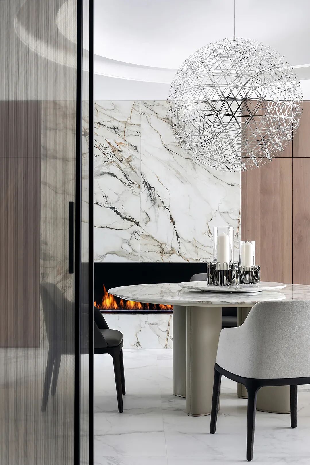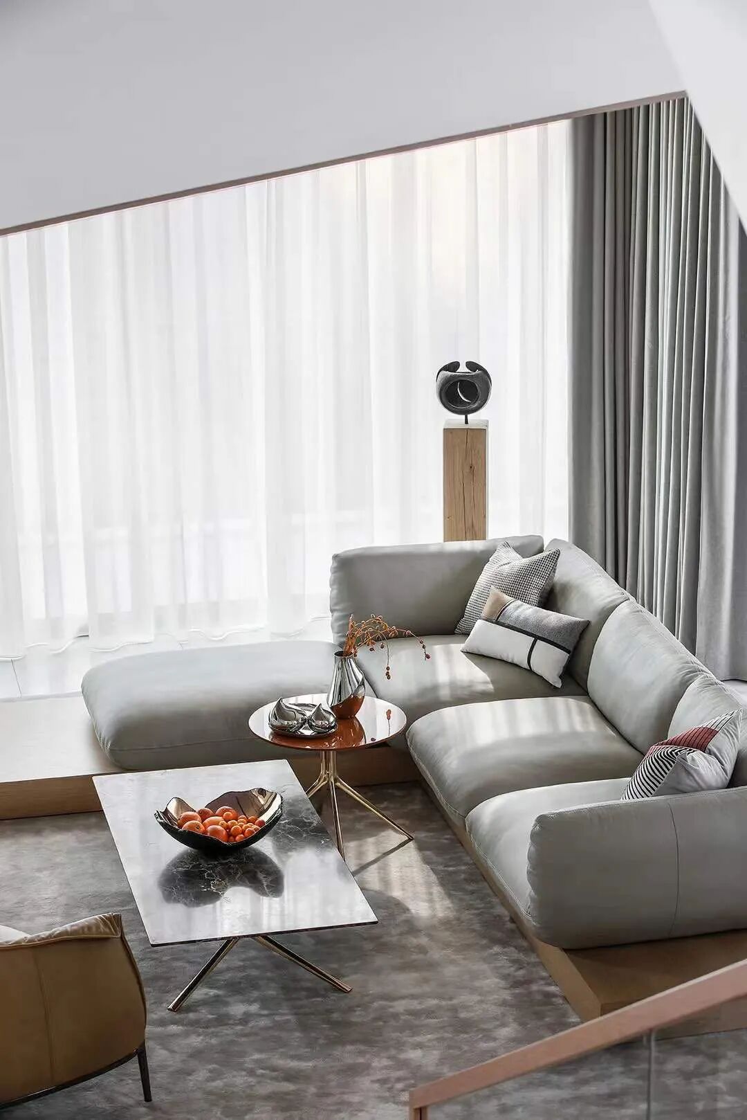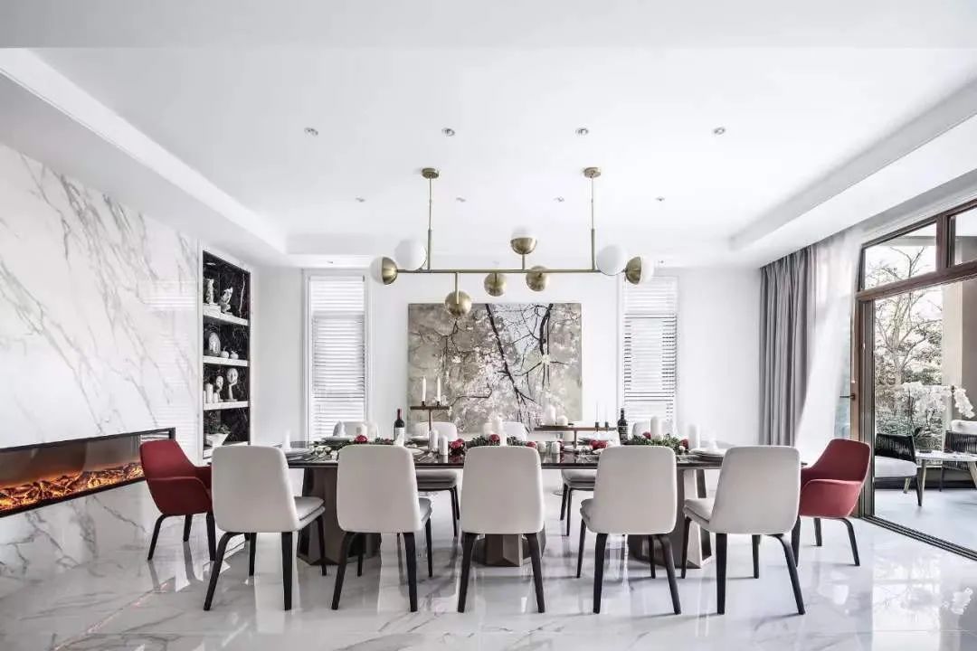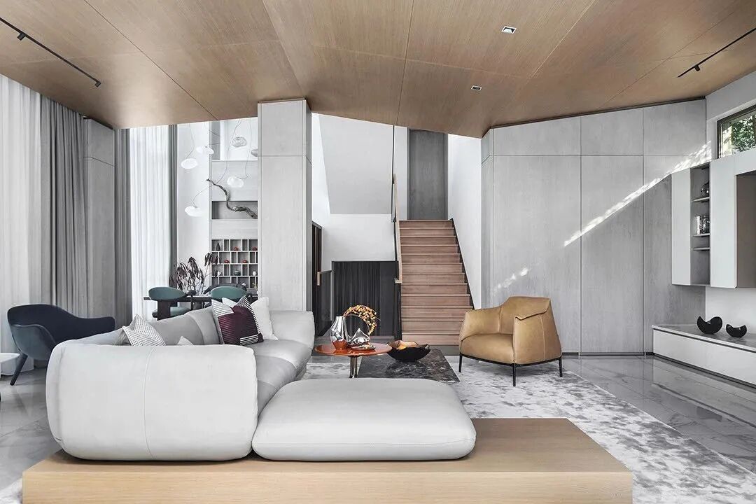 现代主义大师柯布西耶,对设计中的秩序颇为迷恋,他提倡在建筑设计之中,从纵深排列的平面中,创造出一个可以走进去的延伸空间的幻像,达到一种通透感(Transparency)。室内设计中的通透感也源于这种从二维到三维的转化。原有空间,墙体繁多,布局分散,动线关系凌乱而复杂,严重影响了人的居住体验。空间尚停留在二维的平面上,板滞而缺乏层次。设计师将空间中可以打掉的墙全部打掉,重新梳理了空间动线,改变了原有的失序状态,重新确立了立体而通透的空间秩序。如果说空间秩序的重塑,宛如将一首沉闷庸常的音乐,变为一首让人惊叹连连的天籁,那么客厅中心的楼梯则成为调节整首天籁最为关键的和弦,除去灵动自由的形式与带来的切实便利之外,又时刻提示着人对艺术与精致的向往。原本空间是典型的跃层结构,客厅的挑空并未得到合理的运用,用来沟通上下空间的楼梯间被蜷缩退守到角落里,显得格外逼仄,并且失去了空间链接的枢纽作用。