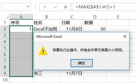 01不能在A2直接输入公式,下拉。合并单元格输入公式的方法跟常规公式不同,切记!