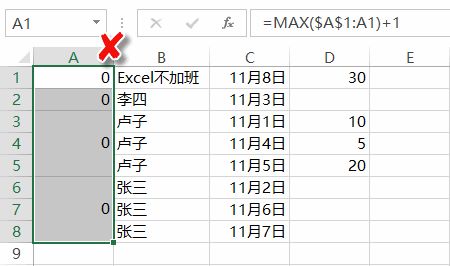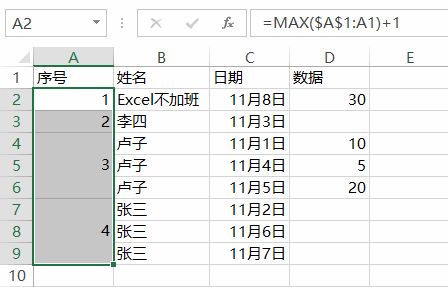 选择区域A2:A9,输入公式,按Ctrl+Enter结束。