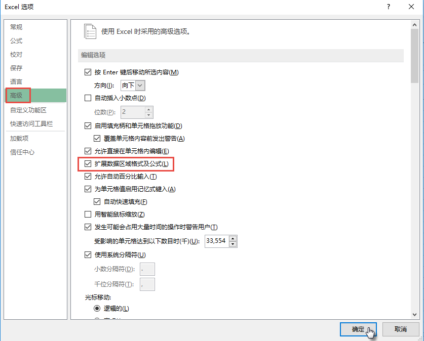 正常默认情况下,公式超过4行只要你重新填写数据,公式都会自动扩展。假如不会,可以进行设置。单击“文件”选项卡→“选项”→“高级”,在“编辑选项”中勾选“扩展数据区域格式及公式”复选框,单击“确定”按钮。