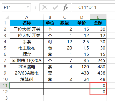 公式计算功能很方便,相信很多初学者会预设公式,这样方便数据输入后能够自动计算,由于公式所引用的都是空单元格,所以计算结果0,因此不够美观,不仅如此,预设公式还占用资源,若要在新输入数据的行中自动填充上一行的公式该如何实现呢?