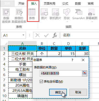 正常情况下我都是采用“表格”实现公式自动扩展。将鼠标放在区域中任意单元格如A1,单击插入“表格”,默认情况下会帮你自动选取区域,保持默认不变,单击“确定”按钮。