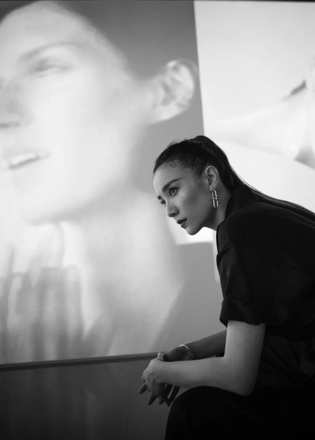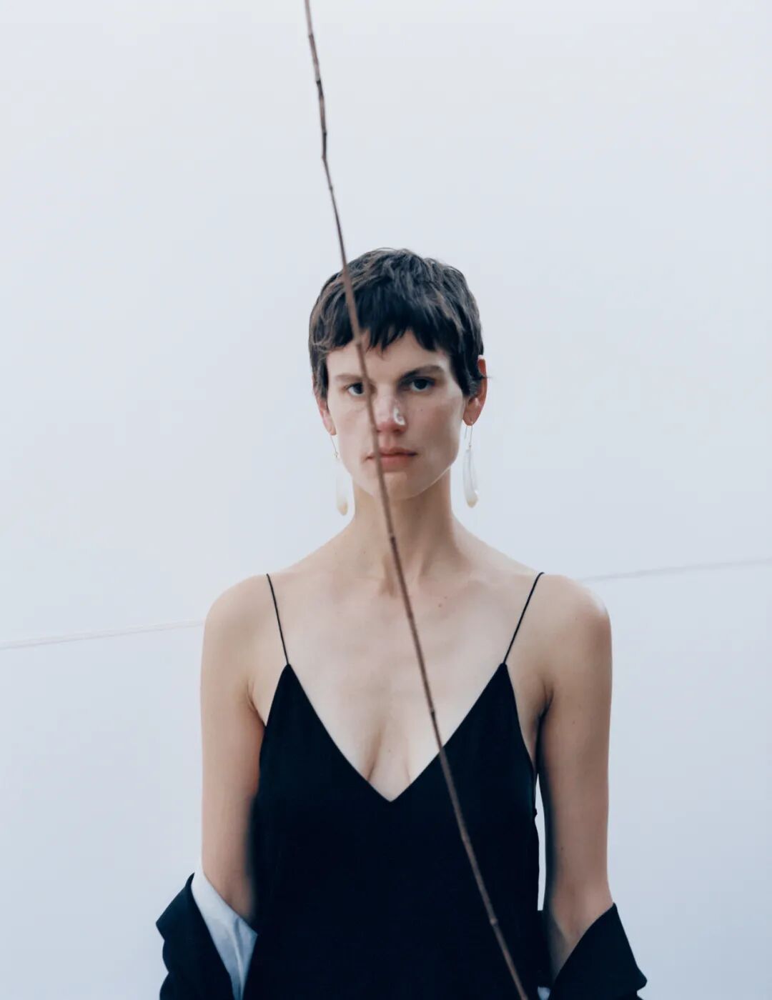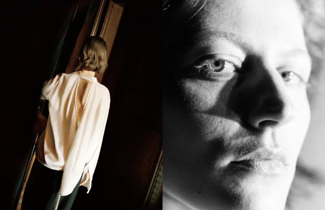 松弛廓形与舒展线条完美融合,低V领口、宽肩线的衬衣与西装勾勒出洒逸的身体轮廓。