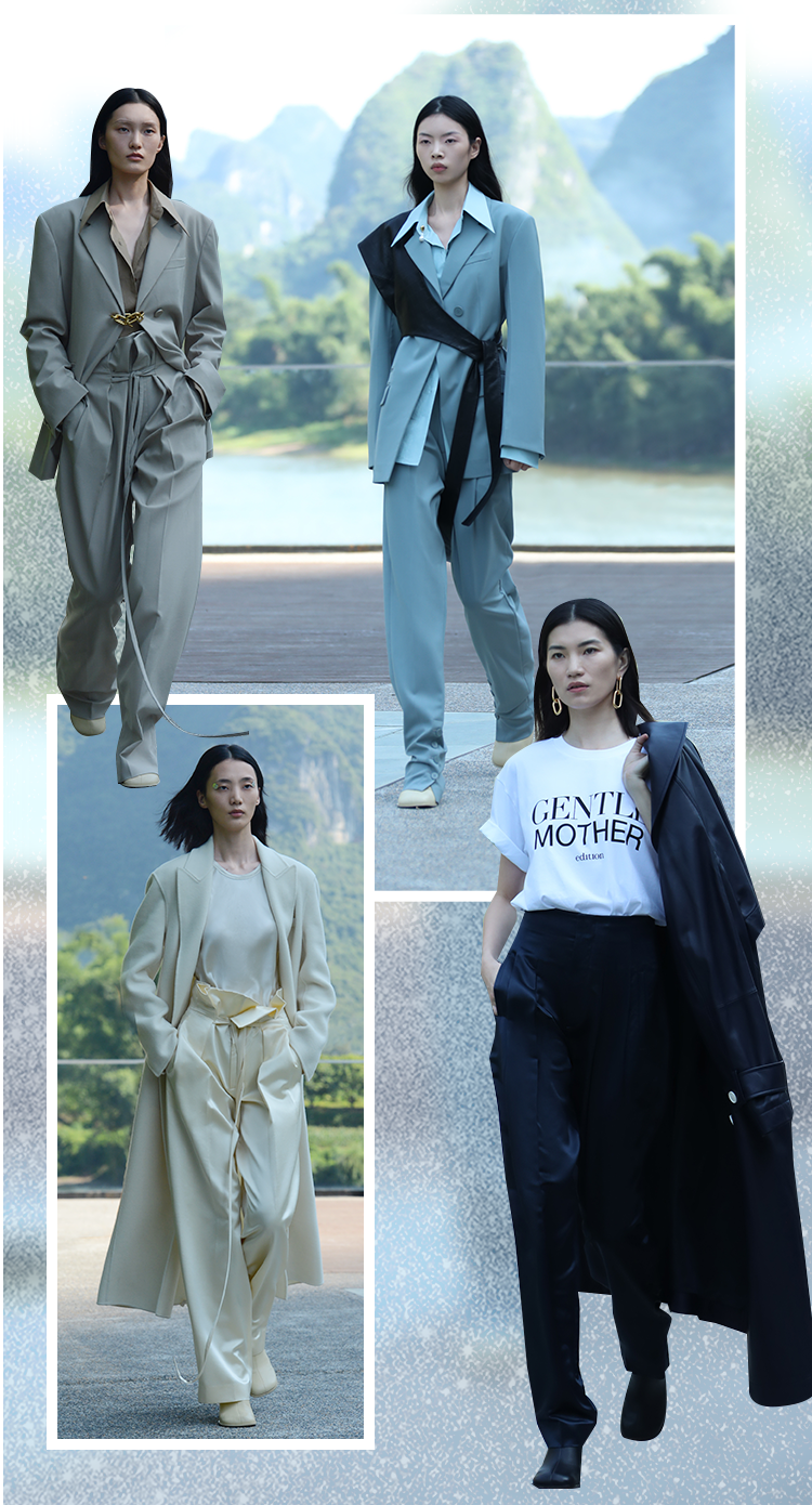 秀由超模贺聪、汪曲攸、李丹妮领衔,其中包括舞者、编辑、学生、教育工作者等来自不同角色背景的女性。整个系列以东方气韵为主旨,讲究张弛有度的风格,高品质面料突出Edition时装的完美质感。