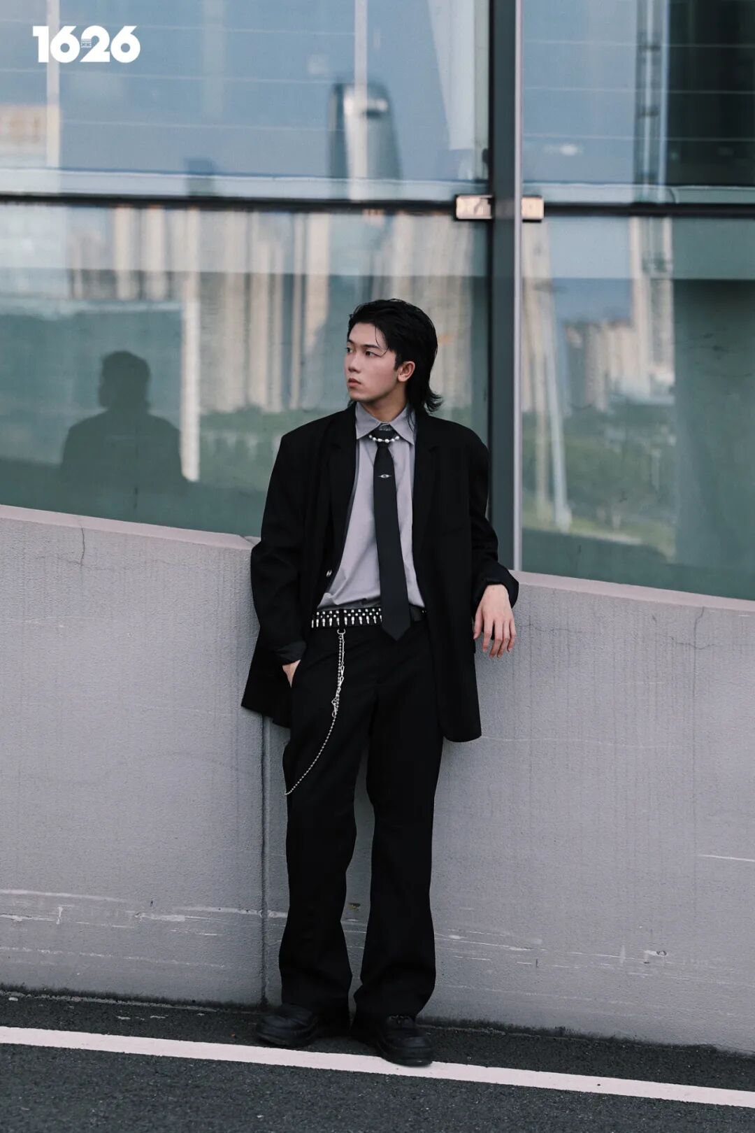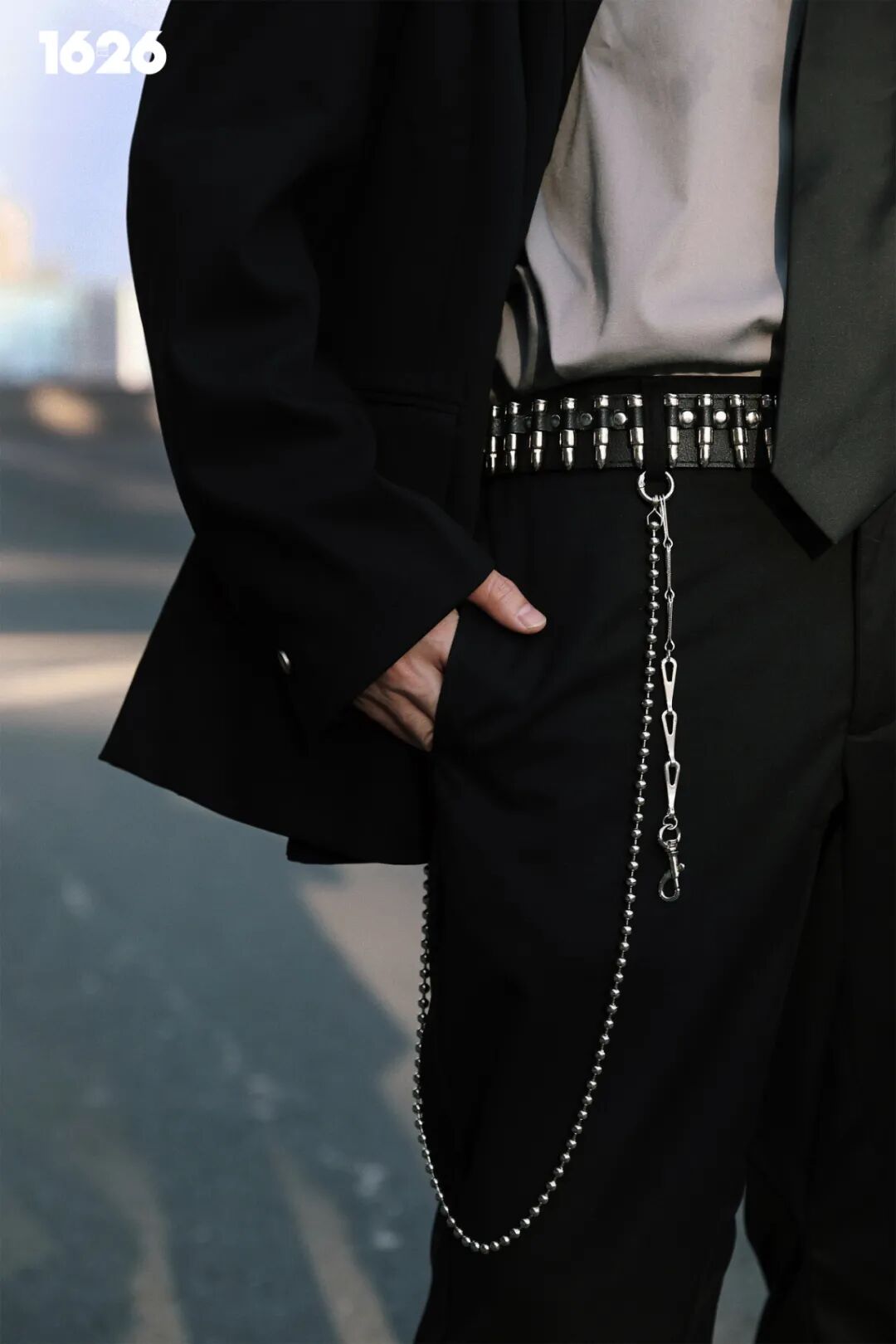 这时候可能有人说,西装配领带也太 DK 了吧?所以就需要珍珠项链叠在衣领与领带之间,搭建出较为立体的结构,还需要注意腰带和裤饰的选择,在整体造型上增添一丝街头感即可。