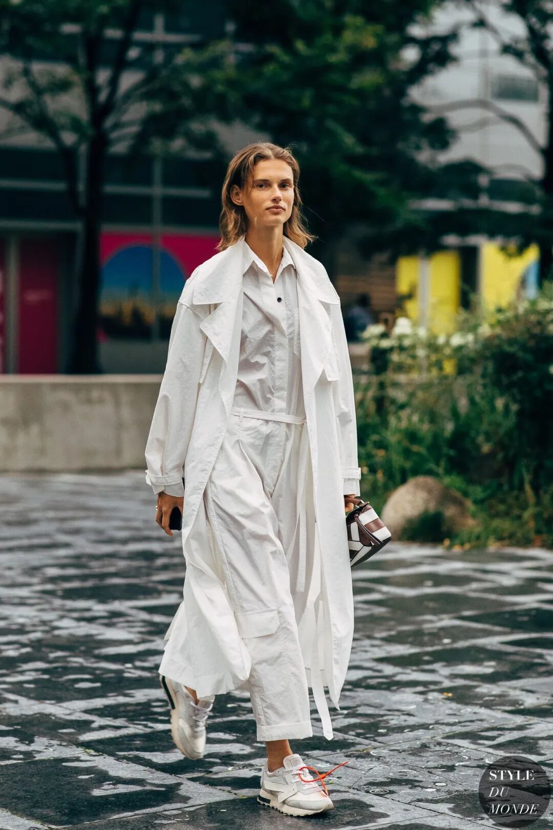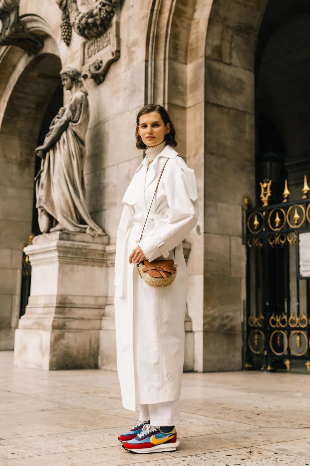 像轻柔干净的白色风衣同色呼应休闲九分裤,随性不羁的型格魅力,即便运动鞋加持都能玩转复古高级味~