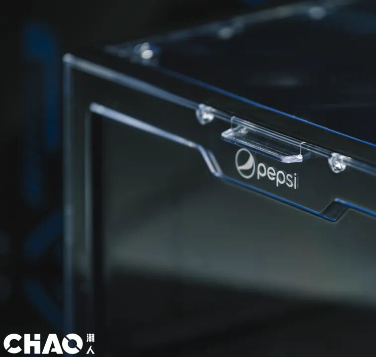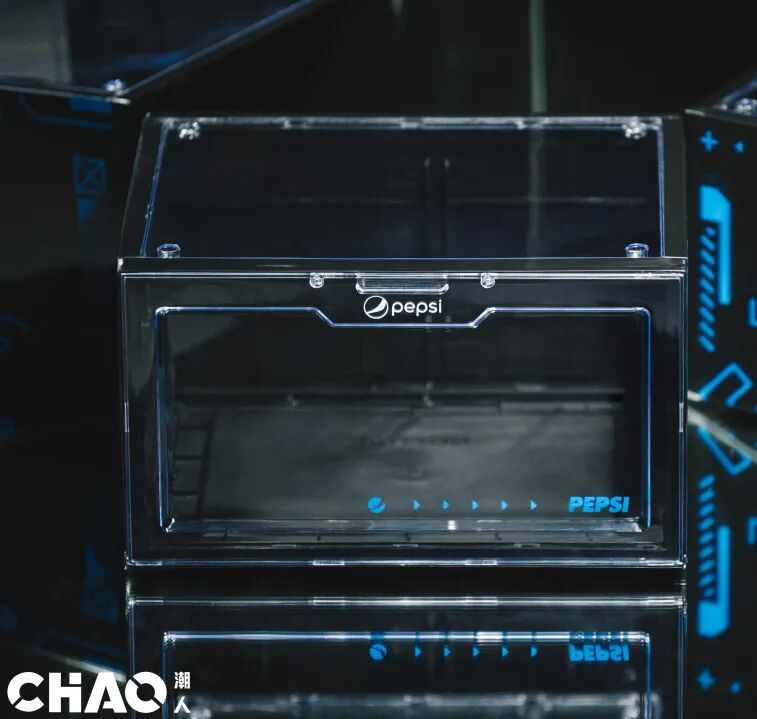这款充满了赛博科幻元素的鞋盒,将百事的logo图案平铺在盒子外侧,透明的盖子可以让你轻易地取出所需的鞋子,细节质感满分,晒鞋拍照拿来当背景板,hin高级。