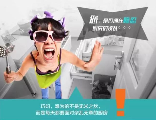 比如下面这张。为了指出用户的痛点,设计师在脏乱差厨房图集锦后,放了一张家庭主妇大声呼喊的图片,图片上还配了文字:您,是否还在隐忍厨房的凌乱??