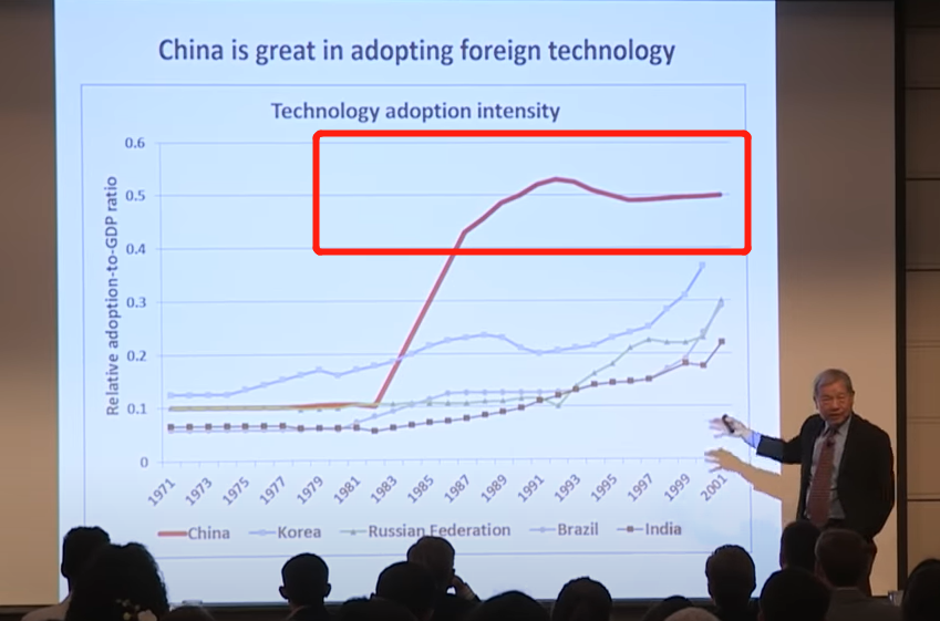 至于为什么中国能做到在很多高科技行业的快速发展呢?黄认为最大的秘密隐藏在下面这个图表中 —— 差别来自对国外科技的转化吸收能力,不管是哪个国家的先进技术,中国企业可以更高效的和中国的实际情况相结合。