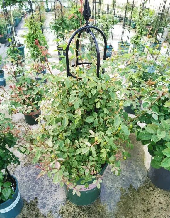 因为是露台盆栽种植,藤本的月季、铁线莲等枝条没地方攀爬。所以,“大毛大人”就买了一批直立的爬藤架,把主枝S形一根一根给盘到攀藤架上,等春夏时节,就能开出这样的花柱子啦!