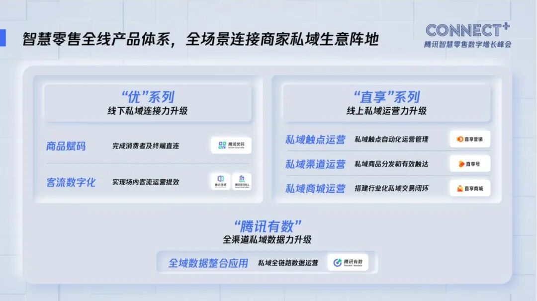我们深入零售行业一线进行调研,也有结合腾讯的一些技术和服务优势,推出三大产品服务体系,来帮助零售企业实现数字化转型。首先推出的优系列全面提升企业线下的私域连接能力,有基于商品赋码的腾讯优码,基于数字化客流的腾讯优Mall体系,同时还推出了直享产品体系,帮助企业做私域化运营能力的提升。为了解决数据运营难,还推出了腾讯有数,帮助企业解决全域数字运营能力的提升。