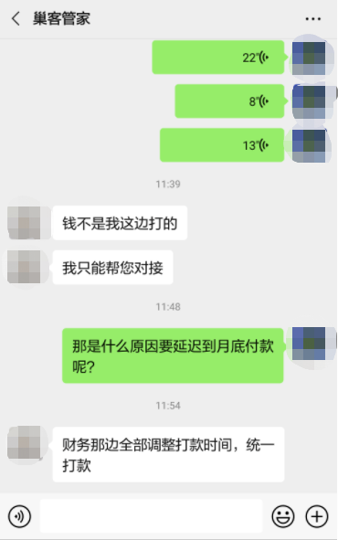 杭州一房主张明在黑猫投诉上投诉称,自己将房子租给巢客,约定每月14日打款(3000元),合同截至2022年5月。但在今年8月,巢客客服多次以延迟打款为由,拖延打款。