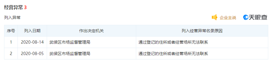 据央视报道,仅成都巢客遇家爆雷事件就牵涉了上海、杭州等地,初步估计涉案金额达到了数十亿元。新浪科技查询发现,该长租公寓仅在今年8月就两度被成都市武侯区市场监督管理局列入经营异常名录,原因为“通过登记的住所或者经营场所无法联系”。