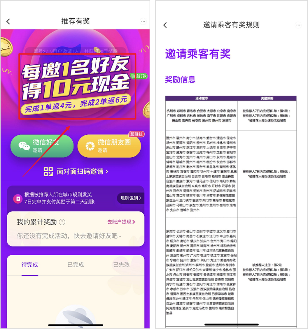 平台在不同地区奖励的具体金额不一样。以南京为例,用户邀请一个好友最高能领取 10 元的奖励,可以直接提现到微信钱包里。