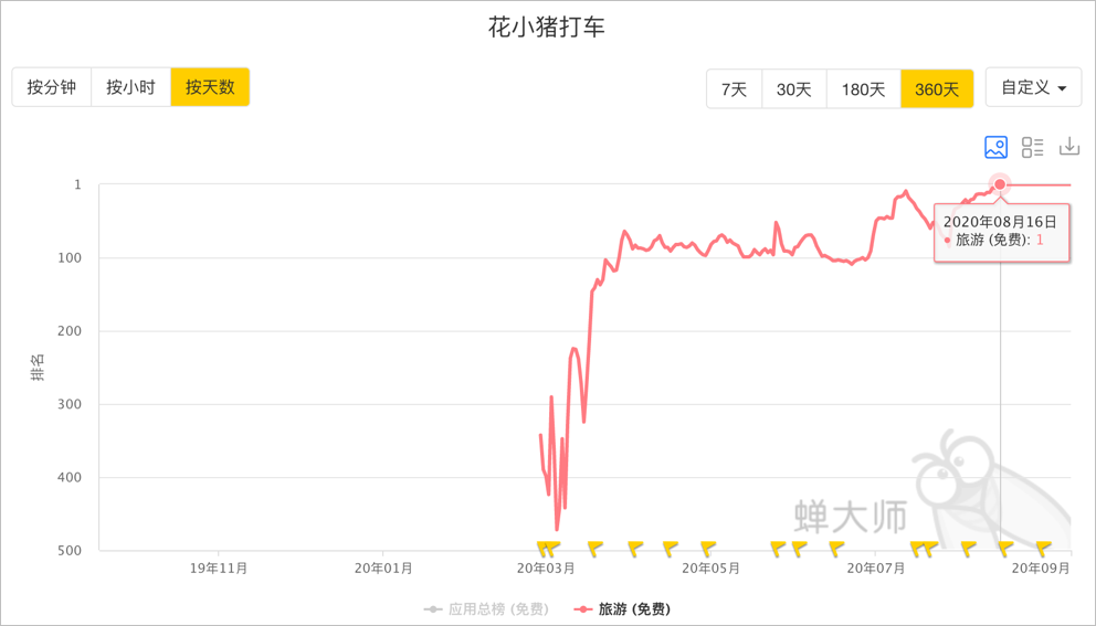 不得不承认,有钱还是很好使的,截至今天,花小猪已经在 App Store 旅游榜第一待了 27 天。(从下图可以看出,花小猪冲到榜首仅仅用了几个月)