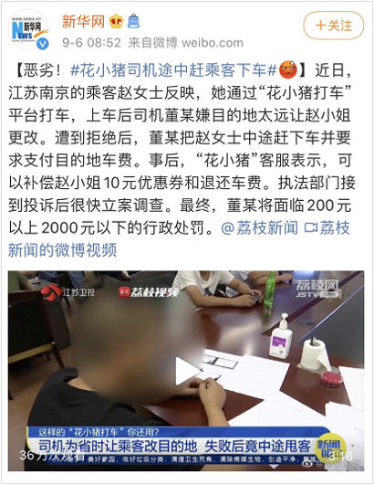 而且即使你能叫到车,也极有可能碰到,素质低、态度差的司机。之前@新华网 就报道过,有花小猪司机嫌目的地太远,直接把乘客赶下车,还要求对方全额支付车费。