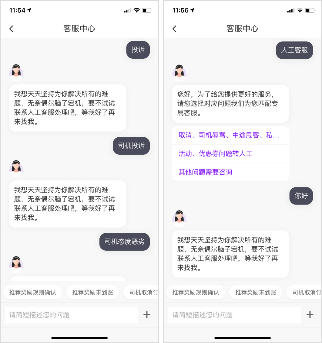司机这么有“底气”,是因为他知道,就算你去花小猪找客服投诉,大多数情况下也只能收到千篇一律的回复话术,根本解决不了什么问题。