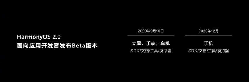 在随后的介绍中还提到,鸿蒙 OS 2.0将面向应用开发者发布Beta 版本,9月10日覆盖大屏、手表、车机,12月份覆盖手机,而明年推出的华为手机将全面适配鸿蒙OS 2.0。
